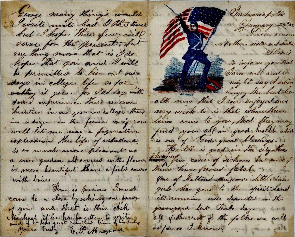 A relative, Walton Musgrave (1828-1874), is mentioned in the letter. In 1860, Walton was a farmer in Warren township, Marion county, Indiana. He was married to Olive Smith (b. 1841) in 1856.