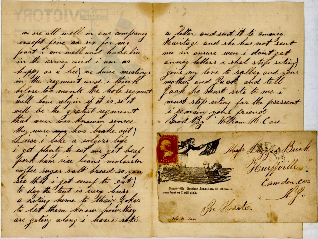 Lizzie, I like a soldier’s life. I get plenty to eat. We get beef, pork, ham, rice, beans, molasses, coffee, sugar, soft bread. So you see that i get enough to eat. Today the tent is very busy a writing home to their folks to let them know how they are getting along. I have wrote a letter and sent it to Anney Hairtage and she has not sent me an answer. When I don’t get any letters, I shall stop writing. Give my love to Sally and your mother and Jack and tell Jack he must write to me. I must stop writing for the present. I remain your friend. Goodbye. — William H. Carr