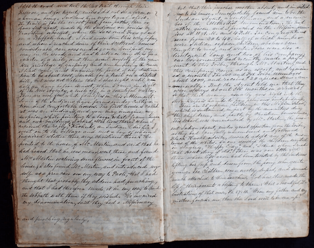 There are very few white families in this settlement. Some of the Indians have farms under cultivation and comfortable houses. The first house I called at was an Indian’s and you may imagine my surprise, while pointing to a large white frame house and out buildings, I asked, “Who lives there?” when I received the reply, “Keokuk, an Indian Chief.” 1 I went on to the village and met a boy of whom I inquired whether there [were] any christians there? He pointed to the house of Mr. [Henry Woodson] Martin and said that he had heard that he was one. I went there and found Mrs. Martin watering some flowers in front of the house. I also found Mr. Martin and introduced myself as a preacher on my way to Paoli; that I had thought that probably they seldom had preaching and that I had therefore made it in my way to spend the sabbath with them if they wished. He inquired my denomination, said they had a Missionary and preaching regularly, but that their preacher was then absent and invited me to his house. I unexpectedly found him to be the Indian Agent, a gentleman, and a member of the Methodist denomination. He had notice given and I preached in the Mission premises at 11 a.m. and 4 p.m. The congregation were from 30 to 40, half of which number were Indian orphan children who have been taught to read and write. There were also a Lieutenant Long and two of his company; our Government had recently made a payment to this Tribe, through Mr. Martin, and this company came as an escort and remained a month.