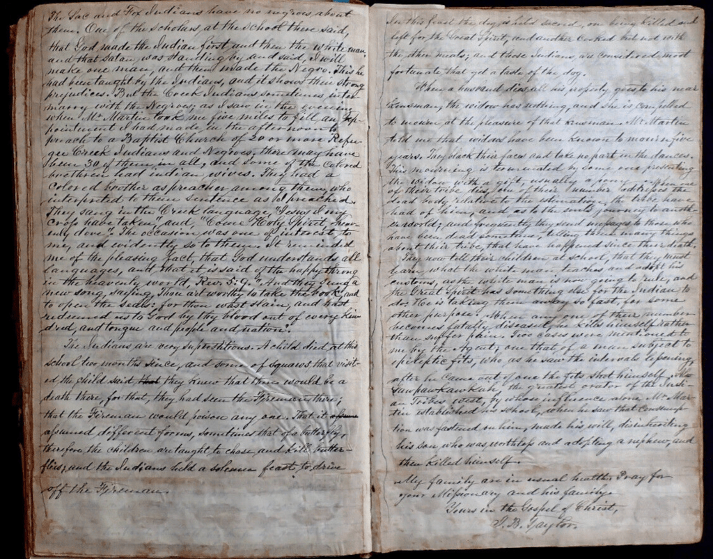 The Sac and Fox Indians have no negroes about them. One of the scholars at the school there said that God made the Indian first, and then the white man, and that Satan was standing by and said, I will make one man, and then made the Negro. This he had been taught by the Indians and it shows their strong prejudices. But the Creek Indians sometimes intermarry with the Negroes; as I saw in the evening when Mr. Martin took me five miles to fill an appointment I had made in the afternoon to preach to a Baptist Church of 20 or more [on] Refugee Creek—Indians and Negroes. There may have been 30 of them in all and some of the Colored brethren had Indian wives. They had a colored brother as preacher among them who interpreted to them [each] sentence as I preached. They sang in the Creek language, “Jesus I my cross have taken,” and “Come Holy Spirit, heavenly dove.” The occasion was one of interest to me, and evidently so to them. It reminded me of the pleasing fact, that God understand all languages, and that it is said of the happy throng in the heavenly world, Rev. 5:9 “And they sung a new song, saying Thou art worthy to take the book and to open the seals: for thou wast slain and hast redeemed us to God by the blood out of every kindred and tongue and people and nation.” 2