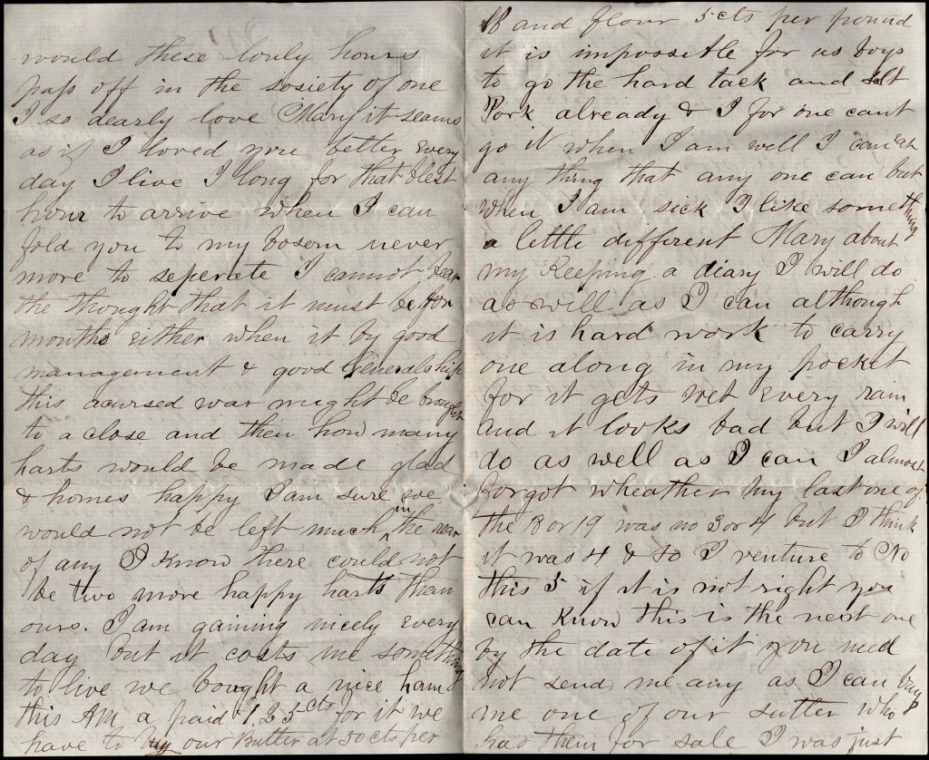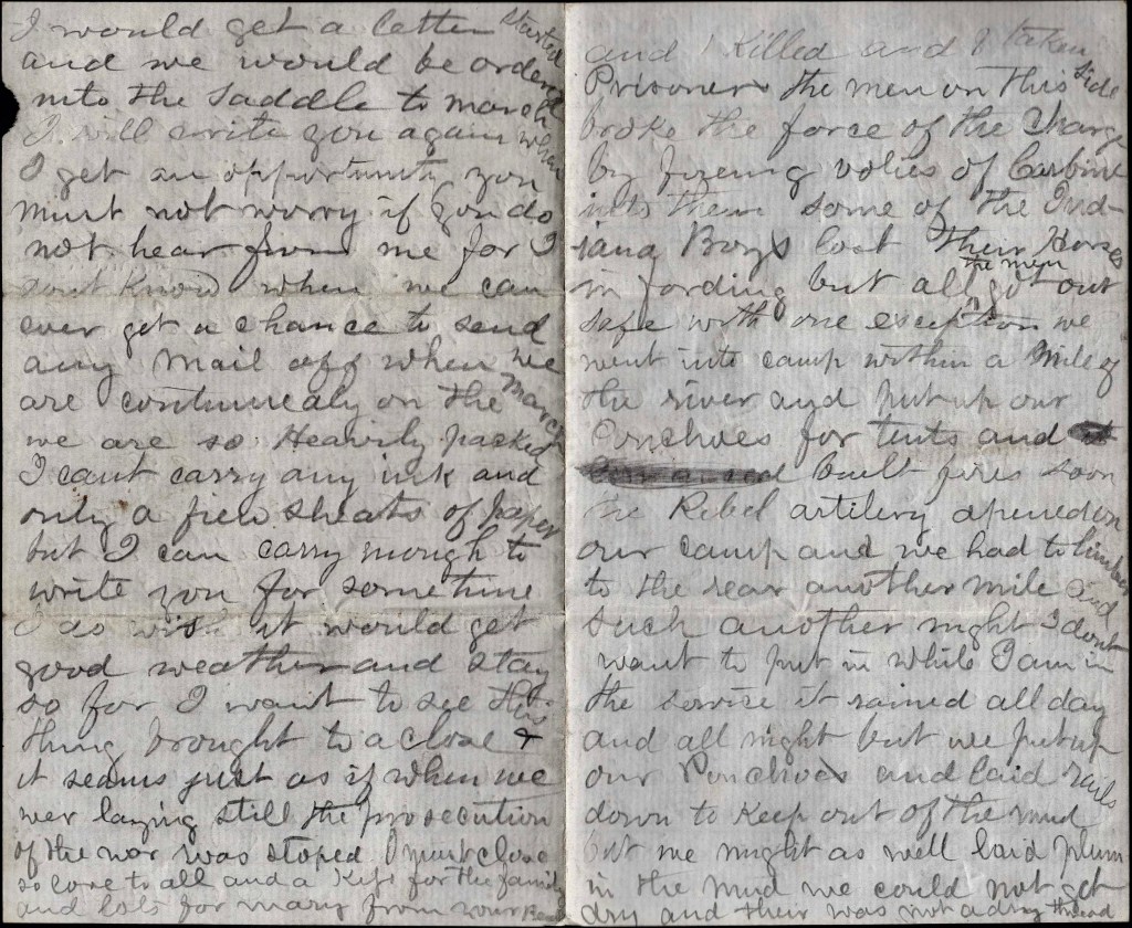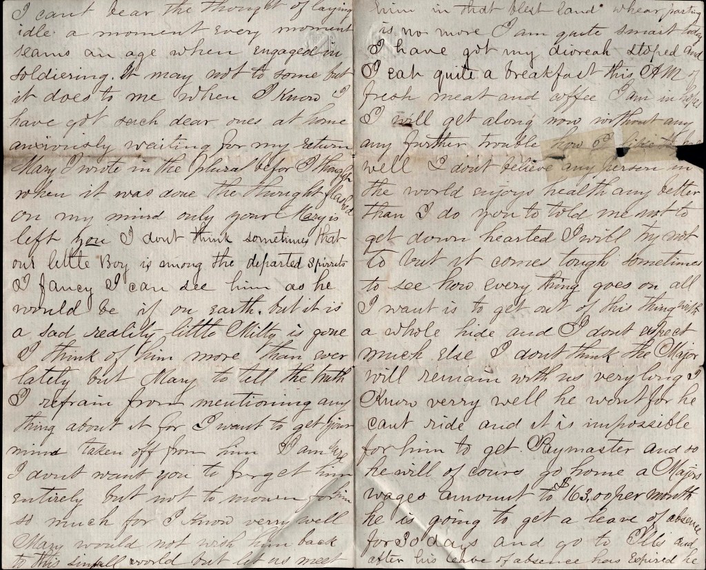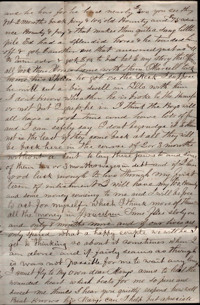 Mary, kiss my little boy for me. How I would like to see him. I can imagine him prattling on your knee & trying to tell you his trouble. I send you 10 dollars. I only drew $19.06 but we were only paid up to the first of November. I know of many of the boys that has not sent a single cent home & hain’t got a cent to their name now & single at that, but I gave a dollar towards the Captain’s saber and pistols & I have bought me a pair of gloves & over hauls & we buy syrup sometimes & butter & it takes some of a person’s change & it does seem to me the boys eat 3 times as much butter as they would if they was at home. But I am bound to live as well as I can. I will let you have all that I can & I want you to use it for your & my boy’s comforts.