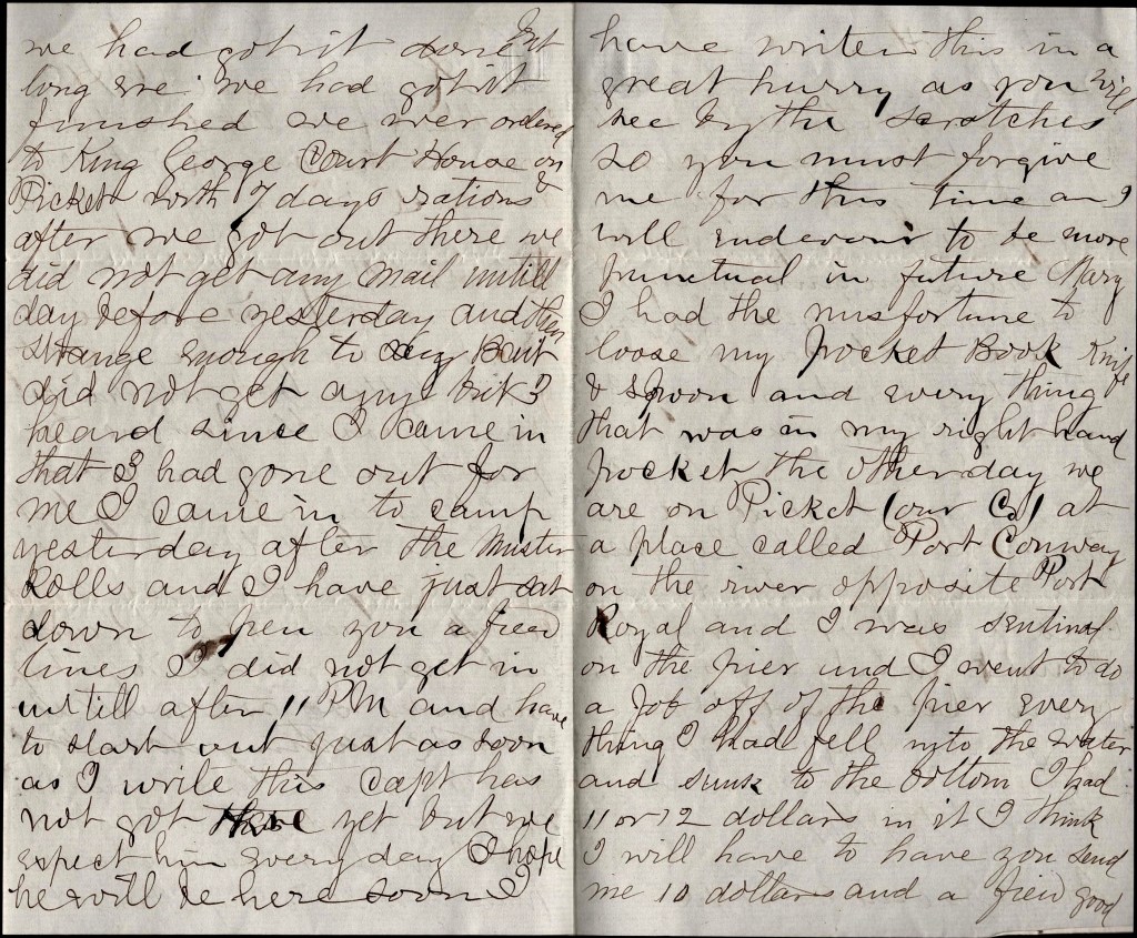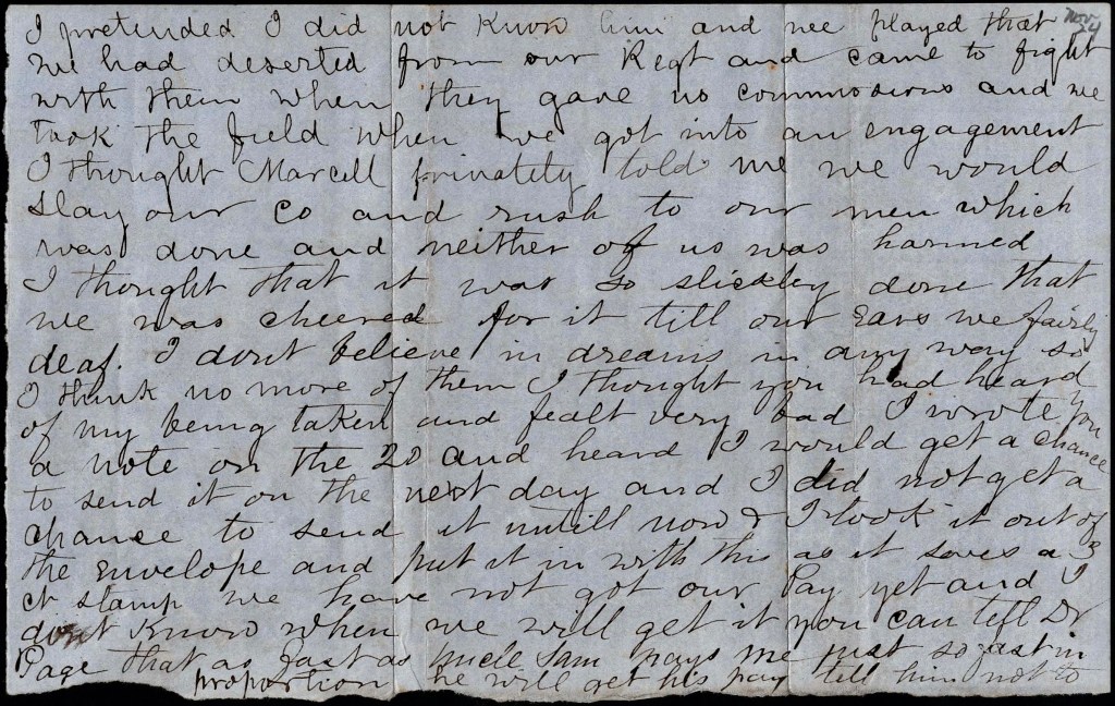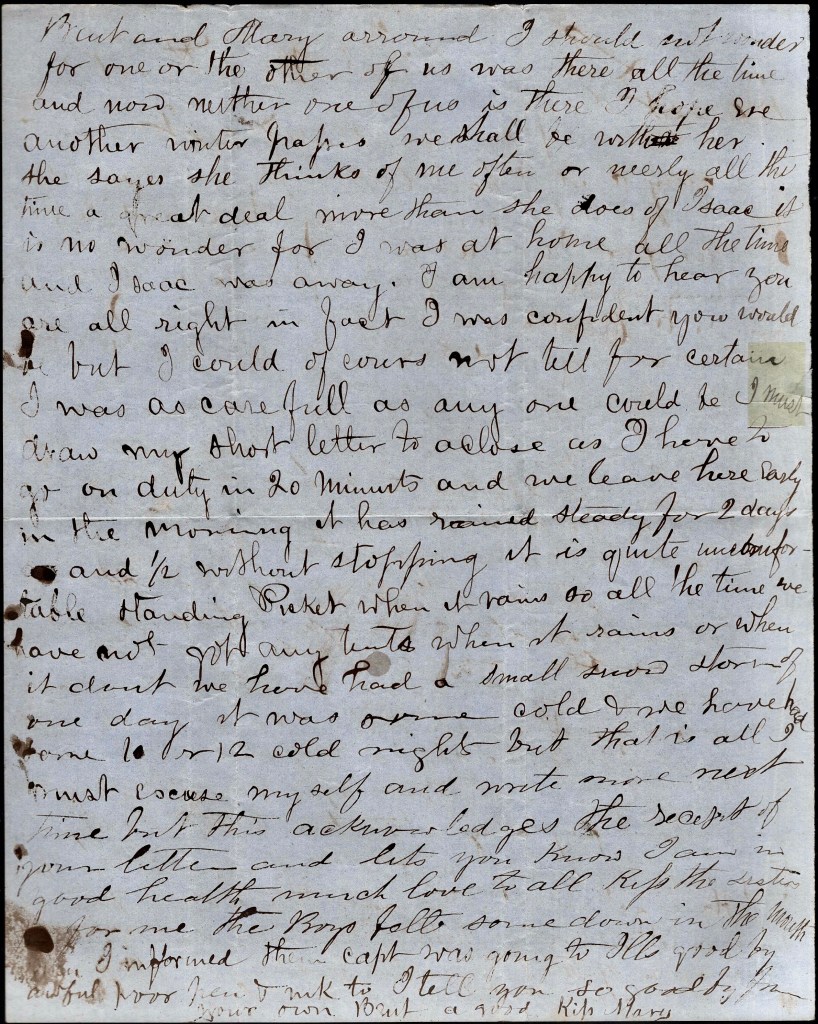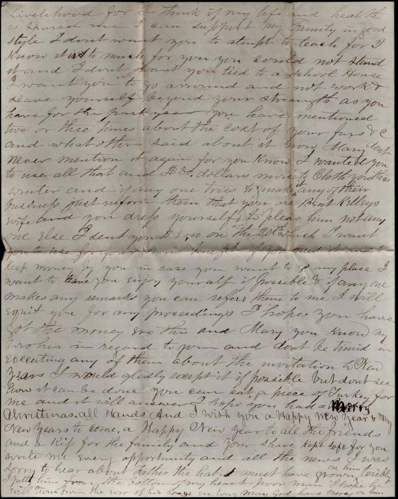Mary, kiss my little boy for me. How I would like to see him. I can imagine him prattling on your knee & trying to tell you his trouble. I send you 10 dollars. I only drew $19.06 but we were only paid up to the first of November. I know of many of the boys that has not sent a single cent home & hain’t got a cent to their name now & single at that, but I gave a dollar towards the Captain’s saber and pistols & I have bought me a pair of gloves & over hauls & we buy syrup sometimes & butter & it takes some of a person’s change & it does seem to me the boys eat 3 times as much butter as they would if they was at home. But I am bound to live as well as I can. I will let you have all that I can & I want you to use it for your & my boy’s comforts.