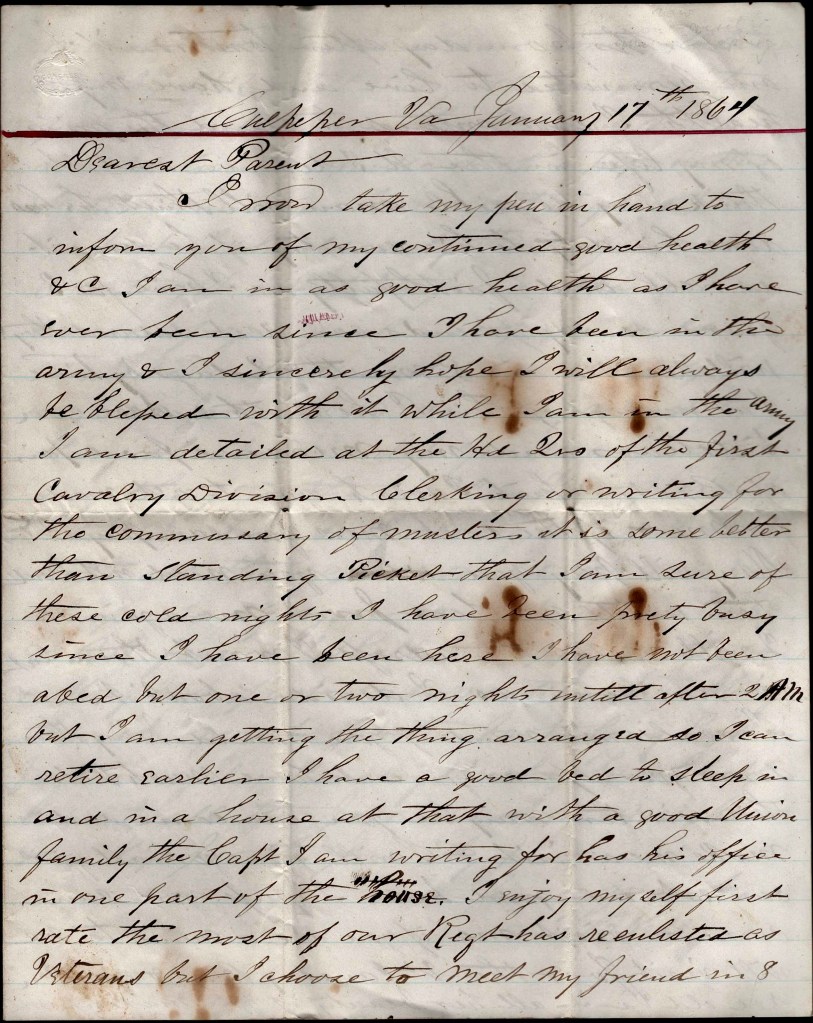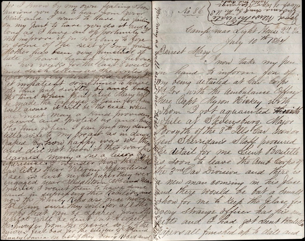 I now take my pen in hand to inform you of my being detailed at Cavalry Corps Headquarters with the Ambulance Officer there—Capt. Myron Hickey—with whom I got acquainted with while at Stevensburg. Major Forsyth of the 8th Illinois Cavalry, now on Gen. Sheridan’s staff, procured the detail for me. Lieut. Boutelle is soon to leave the Ambulance Corps of the 3rd Cavalry Division and there is a new man coming in his place and there would be but a small show for me to keep the place for every strange officer has his own pets and I had got Lieut. Boutelle’s papers all finished up to date. And knowing that I could get this job, I asked Lieut. if he would relieve me and let me accept a detail at Corps Headquarters, and he told me he would with pleasure.