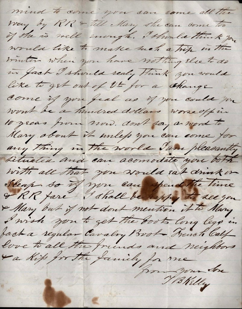 Mary one word in regard to your working. I don’t want you to lift your finger to do anyone’s drudgery. You never had mine to do & you need not do it for anyone else, I am sure. What good is it going to do you to doctor for your health and keep on your feet all the time. Now Mary, won’t you heed me and comply with my request? Your Father is amply able to hire his work done if the other girls can’t do it. You have got money enough to pay for your board if you have not already earned it, and I don’t want you to get all worked down spring poor by waiting on their boarders. Now won’t you stop right where you are and if any questions are asked, just tell them you will pay your board and they must get someone to do the house work. Ellen cannot take much of any interest in the affairs at home or she would help you some. I don’t see how she can do as she does for my part. But enough of this. I have got all tired out and must stop by sending love to all the friends and a kiss for the family and plenty for Mrs. T. B. Write every opportunity & address as per printed envelopes. A lot of sweet kisses for my Mary. Send the photographs as soon as you can and oblige, for Bent will be anxiously looking for them. From your ever loving and faithful husband, T. B. Kelley