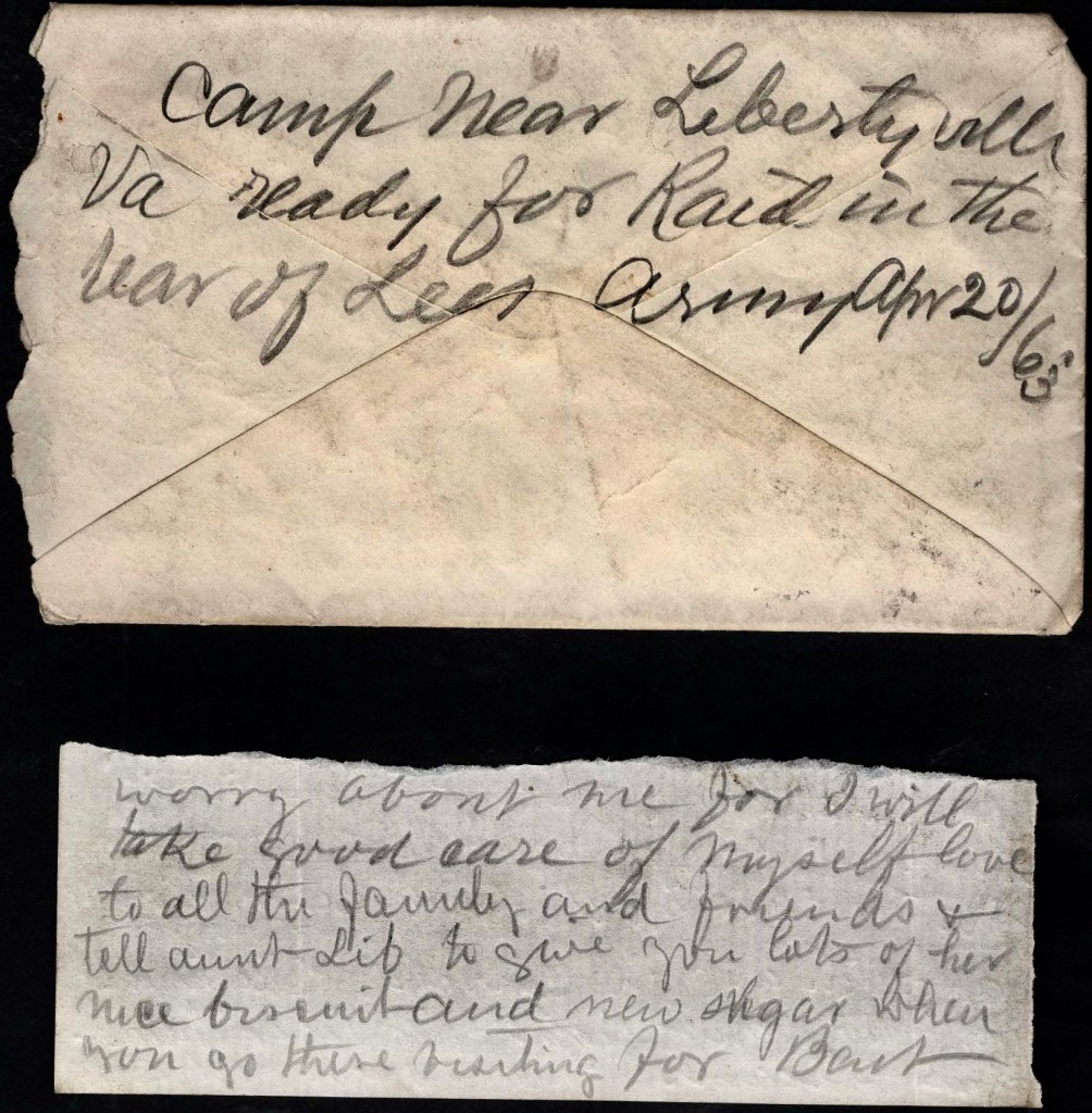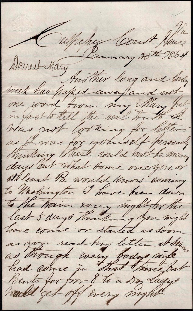 Mary, Aunt Louisa is here now. She has been here some 10 days. I had a real old fashioned visit with her the other night. I went up to the Captain’s tent & while there, the Major came & wanted the Captain & both Lieutenants to go to his tent to school & they went & was gone till after nine o’clock & Aunt & me just had more than a good visit. I could not hardly think myself a soldier come to get really to visiting with her & talking about our near & dear friends. I tell you, Mary, you was often thought of that eve. I had just saw her before that but only a moment—only to say, “How do you do?” and I have not seen her to speak to her since. She boards about 1/3 of a mile from camp & she don’t get over here often & it is a hard matter to get outside the guard unless something of great importance & I have had 1 good visit with her & that must suffice for a while at least.