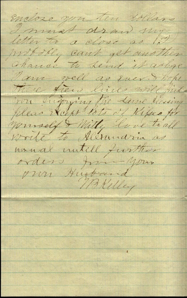 My kind regards to all the friends and kisses for the family. Let me hear from you every opportunity and all the news. Lots of sweet kisses for my dear, dear wife. from your loving husband, — T. B. Kelley