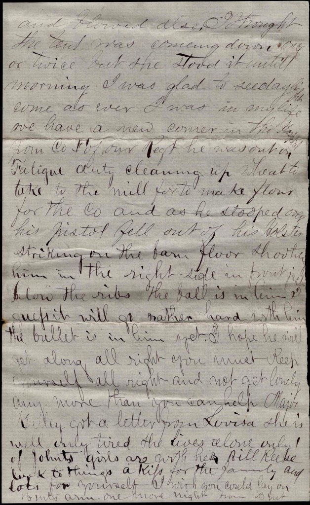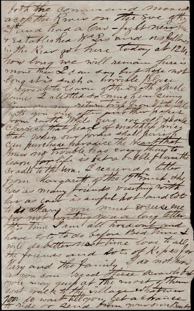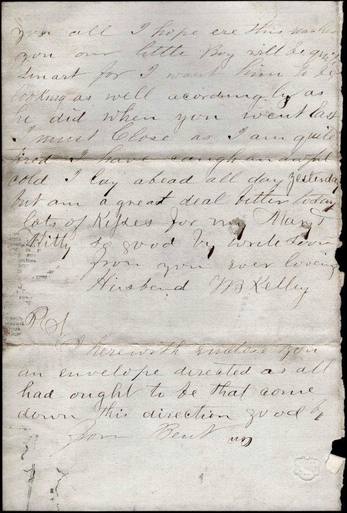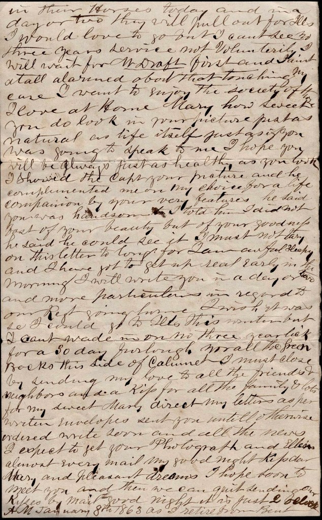 I was awaked last eve at 10 p.m. by the cry of the mail boy (“letter for Kelley!”). I got up and hunted all over camp for a light but no one had one. I came back and blowed up a coal or fire & hunted through our mess box and succeeded in finding a small piece. I think I could not enjoy a night’s rest with one of your unbroken letters in my possession. Indeed, I never would like to try it as an experiment. How I love to get those welcome messengers, ever breathing tones of love and prayer for my welfare. How could I think of retiring to my soldier’s couch with one of those precious messengers in my possession still unbroken. I could not sleep one wink, I am sure, for many a night have I lay and thought of my wife until 12 or 1 o’clock before I could or even think of sleeping. I hope soon to be permitted to be with her who so anxiously looks for my return. The time for my term of service to expire slowly approaches. I don’t know whether I ever saw time pass more sluggishly along. I am sure it is all on account of our anticipating so much happiness in each other’s society that makes it so.