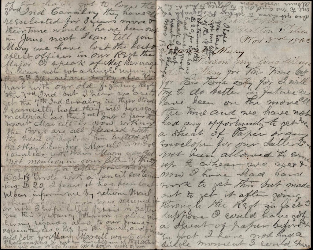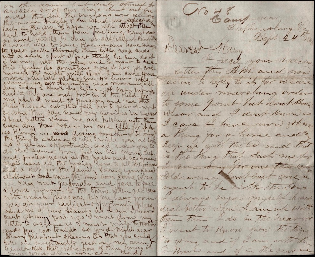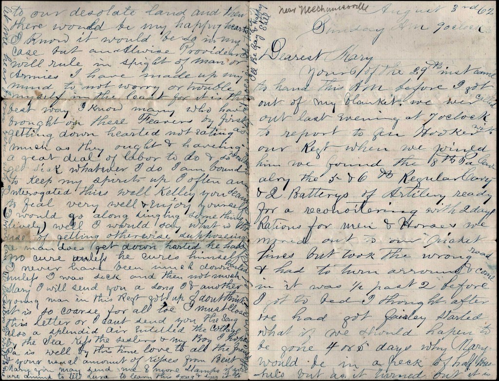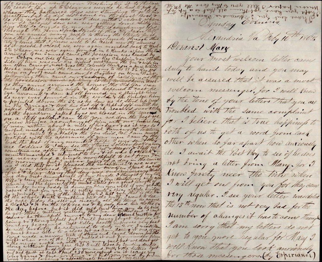 I well know you are anxiously looking for the arrival of this welcome messenger, but when I inform you that no mail has arrived at or left these Headquarters in four long days, you cannot help but see the reason for the delay. When I understood that no mail came or left, I did not write my usual letter for I would have to carry it about my person for there would be no mail bag to put it in, so I thought I would put off writing until it was resumed again. Last eve the mail came in and I think there will be one going out tomorrow. None left this a.m. but there never does on Sunday. But anyway, I will pen a few lines and run the risk of sending them to my Mary.
