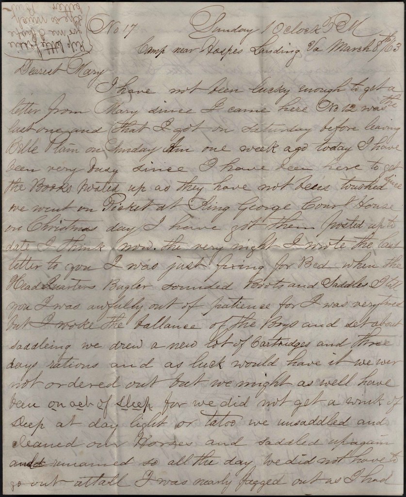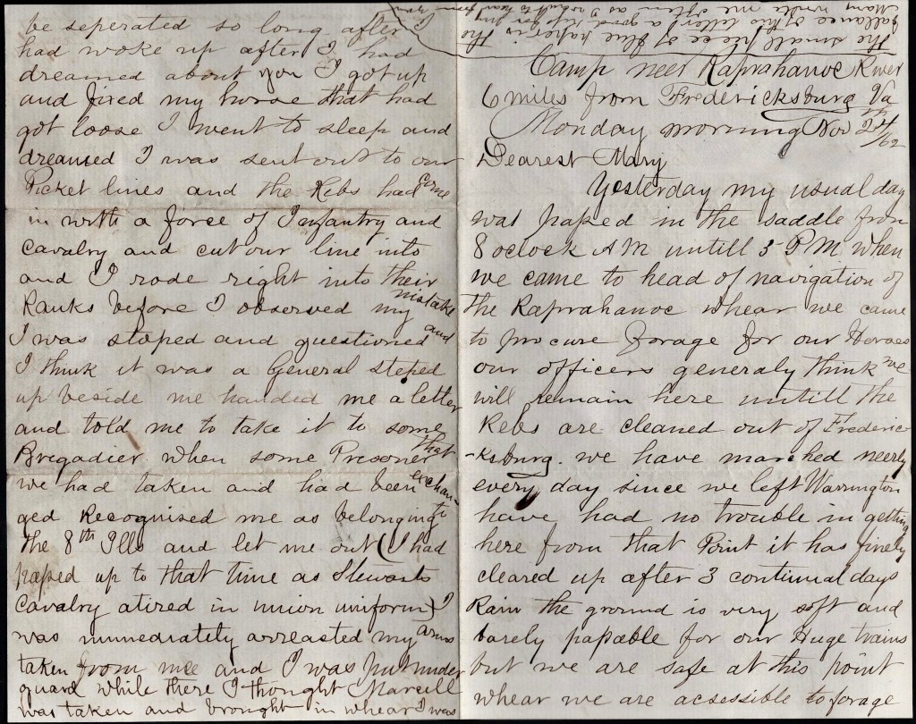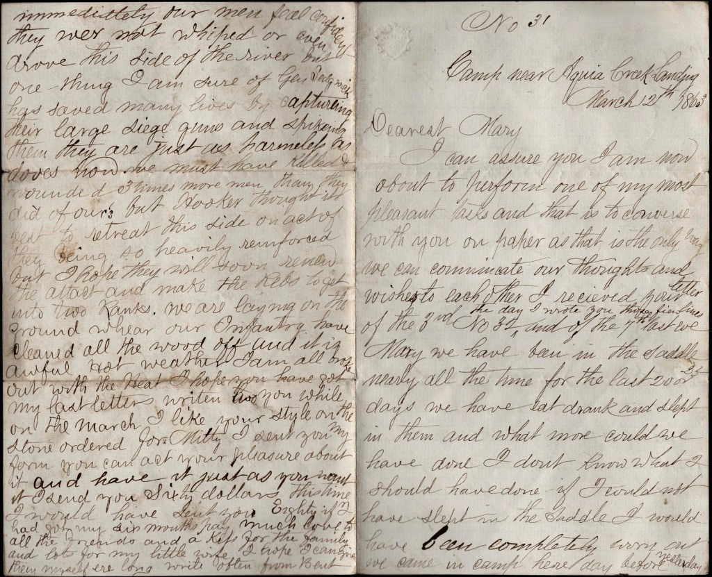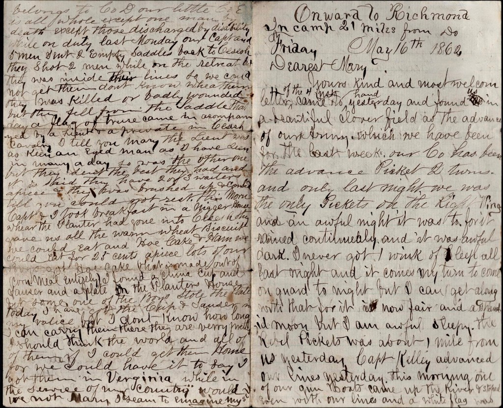 I well know you are anxiously looking for the arrival of this welcome messenger, but when I inform you that no mail has arrived at or left these Headquarters in four long days, you cannot help but see the reason for the delay. When I understood that no mail came or left, I did not write my usual letter for I would have to carry it about my person for there would be no mail bag to put it in, so I thought I would put off writing until it was resumed again. Last eve the mail came in and I think there will be one going out tomorrow. None left this a.m. but there never does on Sunday. But anyway, I will pen a few lines and run the risk of sending them to my Mary.