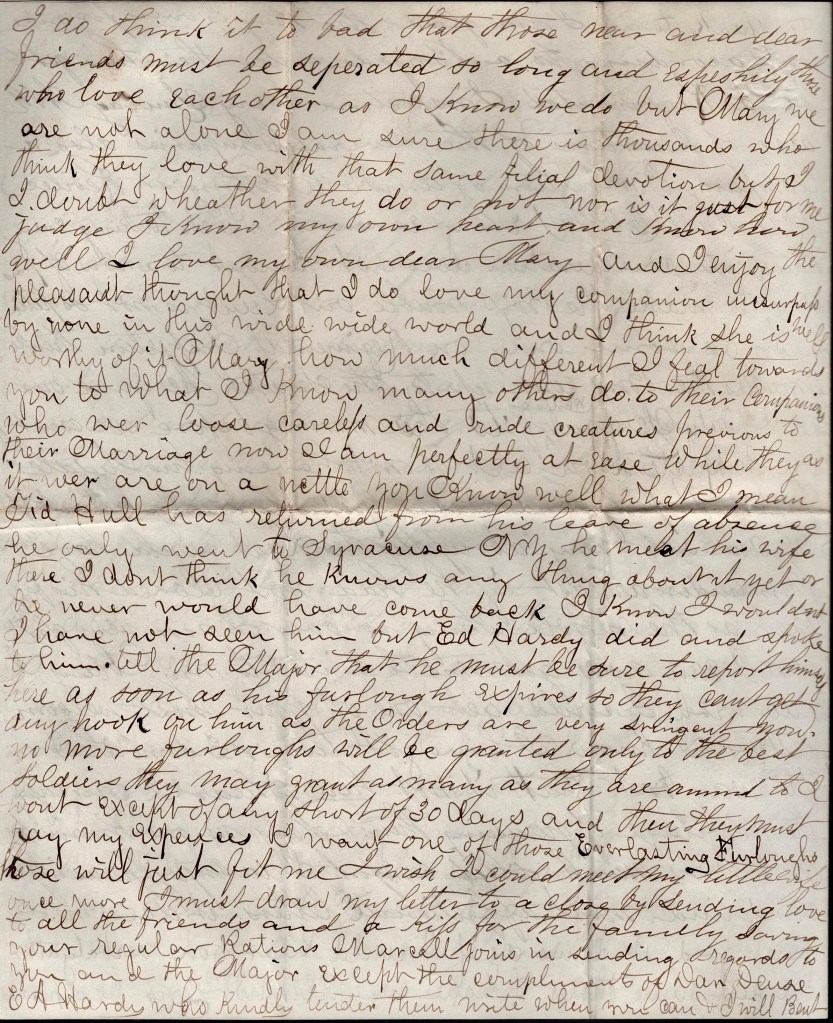 Mary give much love to all our friends & kiss the sisters & my dear, dear boy. Oh how I would like to see him. Don’t let him forget his soldier Pa Pa. Why in the world don’t sister Lura write me a letter? She owes me a letter yet & tell her I want her to pay her debts in this my time of need. Mary, will we not enjoy it if we even get to keeping house with our little one & then we can think one these self same times & see how in our (minds eye) just how we felt & were situated. Dear Mary, is there not a wide difference between now & one short year when we were in that parlor of Father’s by that comfortable stove & my Mary could sit on my knee with her darling in her lap. But Mary, it only makes me feel lonely to recall those happy days to mind, but in the mercy of a kind Providence, may our lives be spared to meet and spend the remainder of our days in peace & happy times which is the prayer of your dear Bent. Kiss to all & love.