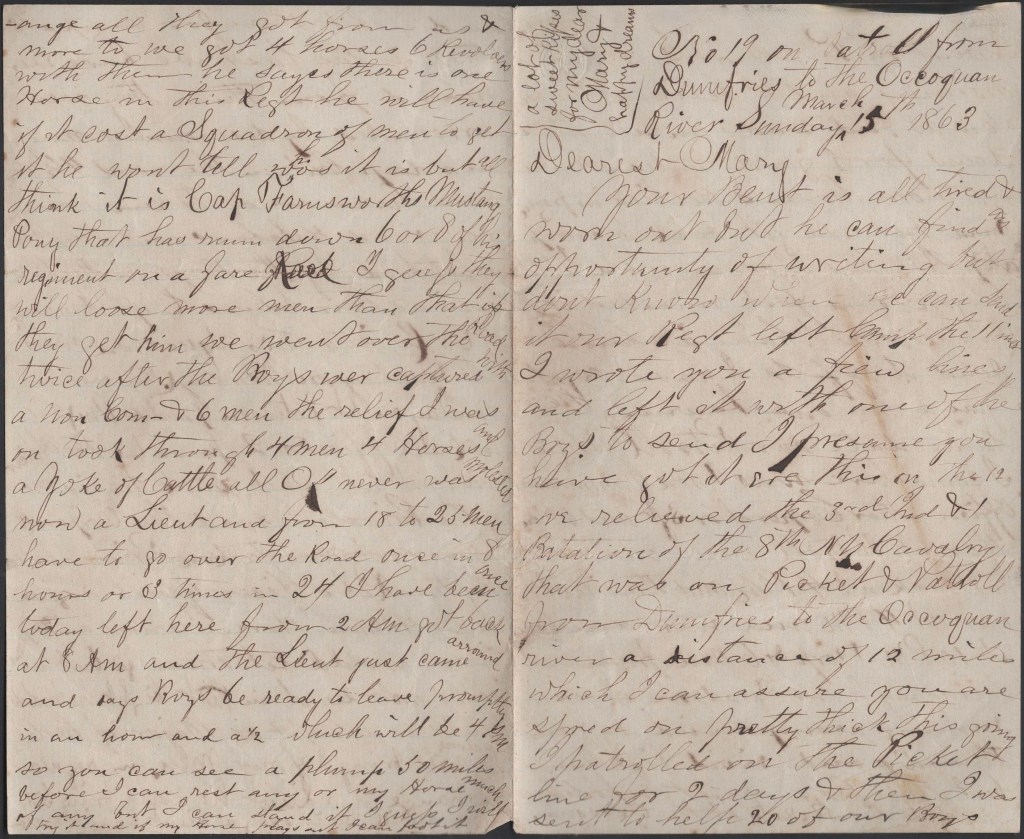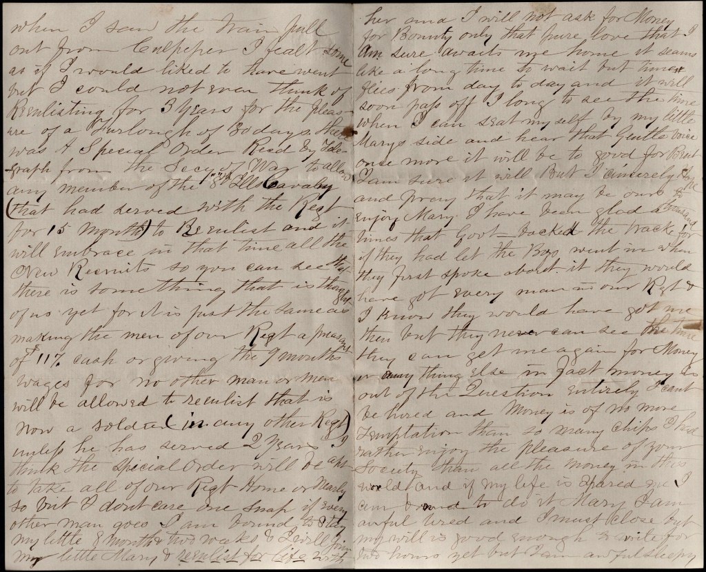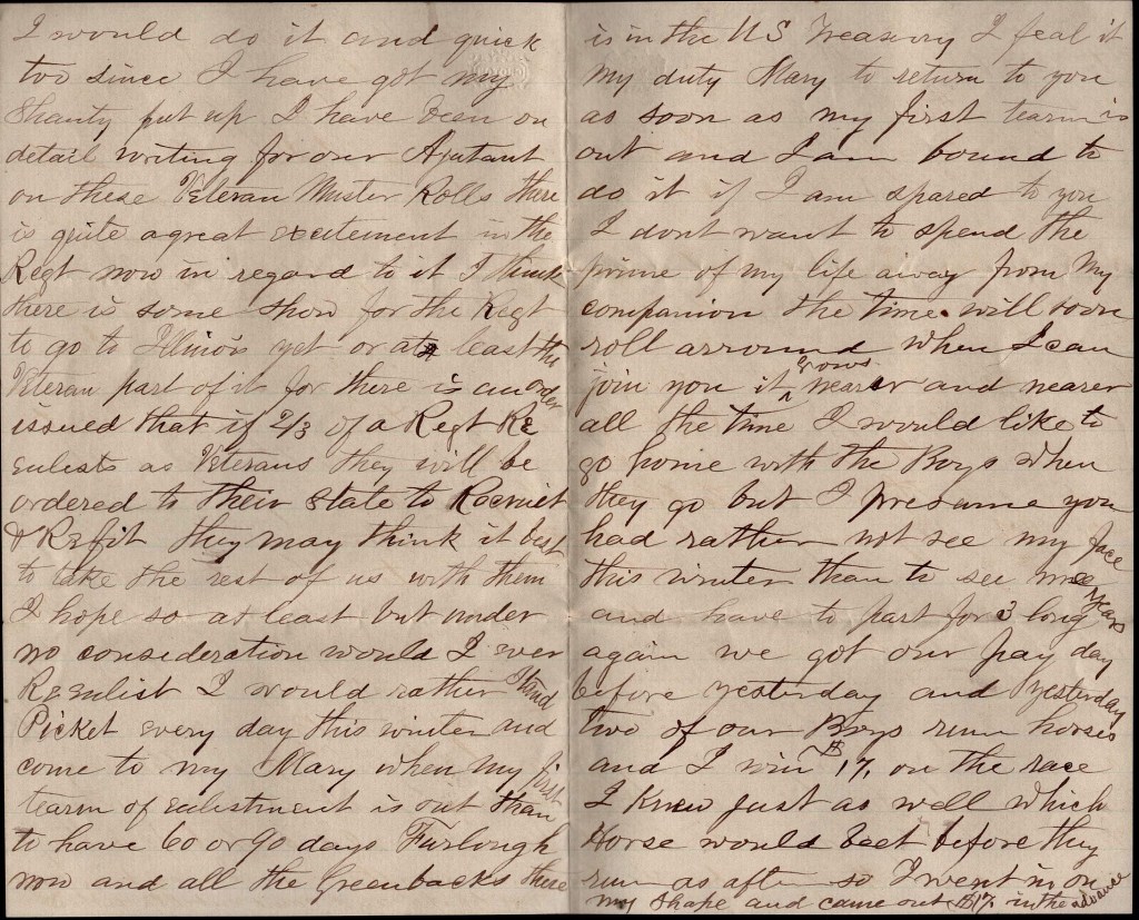 One more of those welcome messengers reached me yesterday and happy I was to get it for nearly one week had elapsed without hearing from you. I have got rid of two of my felons and the others do not pain me much. All of our boys were sent to dismounted camp on the 1st inst. and they en mass made application to be mounted and join the regiment so Col. Gamble—our own colonel—sent us horse and equipments and we got to our regiment last night. The regiment has just returned from a raid through Loudon Valley, Virginia, and they will probably remain quiet for the next three weeks. I would not stay in dismounted camp for $5 a day. Capt. Buck told me I should not have to do anything but take care of my horse until my time was out so you can rest assured if I have my health, I will be with you soon. Only 14 more days. If they keep us in the field until our time is out which I know very well they will not, Mary will we not be once more thankful for the kind protecting care that has watched over us in the hour of exposure and trial? I hear a still small voice answer (truly we will).