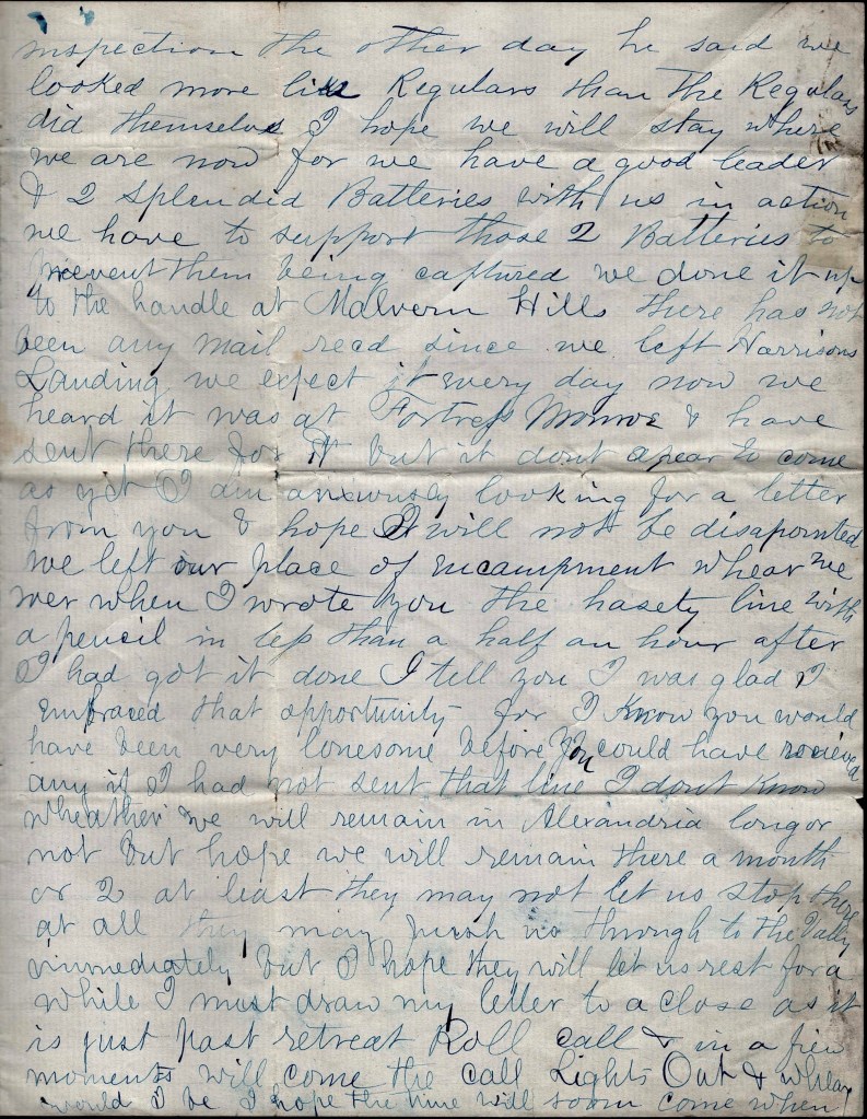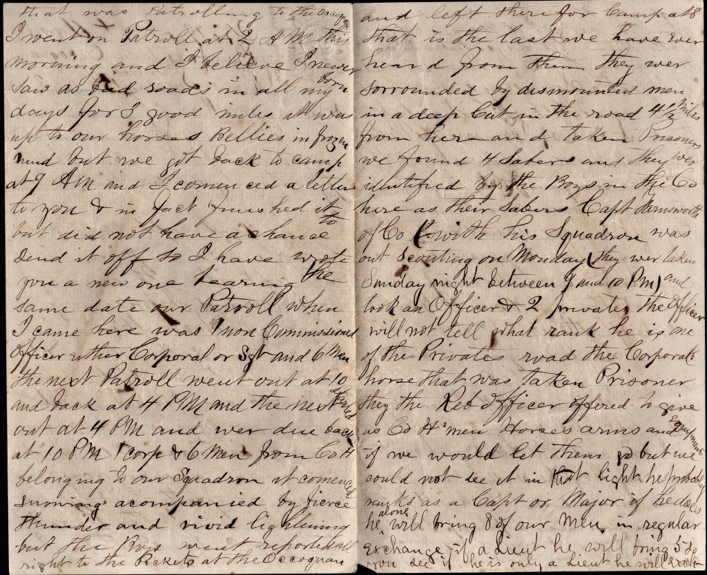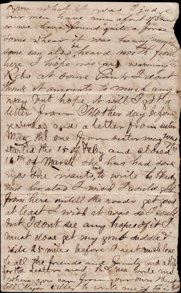 Fifty of our Battalion (the First 1) were called out the other night and we were armed with carbines & sabers & we rode as fast as the horses could run for six miles, to the extreme outposts of our pickets, and when we arrived there, six regiments of our men were drawn up in line of battle accompanied by a Battery of artillery. We were ordered to dismount & put caps on our carbines & we stood at our horses’ heads for a half an hour when we heard nothing from our opposers, after which three companies of infantry were sent out as skirmishers & were gone until 7 o’clock next morning when they returned and stated that the pickets had had a small skirmish & that they had driven the rebel pickets in two miles & had not been opposed & there was no sign of an attack & we waited about ½ an hour longer & rec’d orders from the General to return to our quarters which we did on a walk, which was a little different from the way we went. Lt. Flagg’s brother was one of the boys from our company & he got unhorsed on our way over there but was not hurt much so but what he went along.