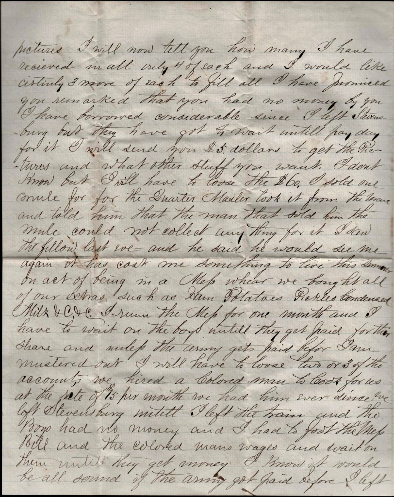 You remarked that you had no money by you. I have borrowed considerable since I left Stevensburg but they have got to wait until pay day for it I will send you $5 to get the pictures and what other stuff you want. I don’t know but I will have to loose the $60. I sold one mule for the quartermaster took it from the man and told him that the man that sold him the mule could not collect anything for it. I saw the fellow last eve and he said he would see me again. It has cost me something to live this summer on account of being in a Mess where we bought all of our extras such as ham, potatoes, pickles, condensed milk, &c. &c. I run the Mess for one month and I have to wait on the boys until they get paid for their share. And unless the army gets paid before I am mustered out, I will have to loose two or 3 of the accounts. We hired a Colored man to cook for us at the rate of $15 per month. We had him ever since we left Stevensburg until I left the train and the Boys had no money and I had to foot the Mess bill and the colored man’s wages and wait on them until they get money. I know it would be all sound if the army got paid before I left but I fear they won’t and I would not give much for a debt after I got away from the army. I will not take on about it for everything may come out all right yet. I know I am money ahead yet and would not feel it if I should have to loose 60 or 70 dollars but a penny saved is as good as one earned and I will have a plenty of use for Green Backs when I get home again and I want all I can get and get them honestly.