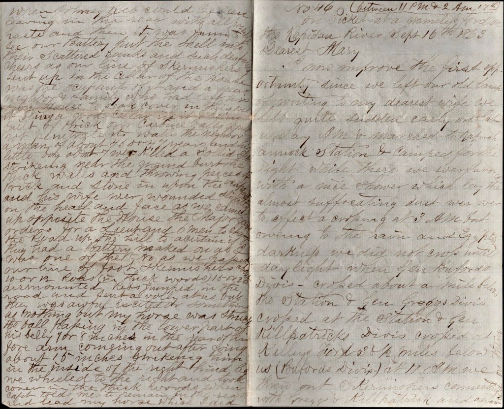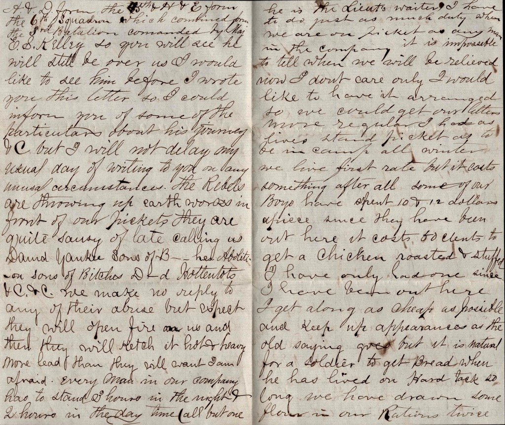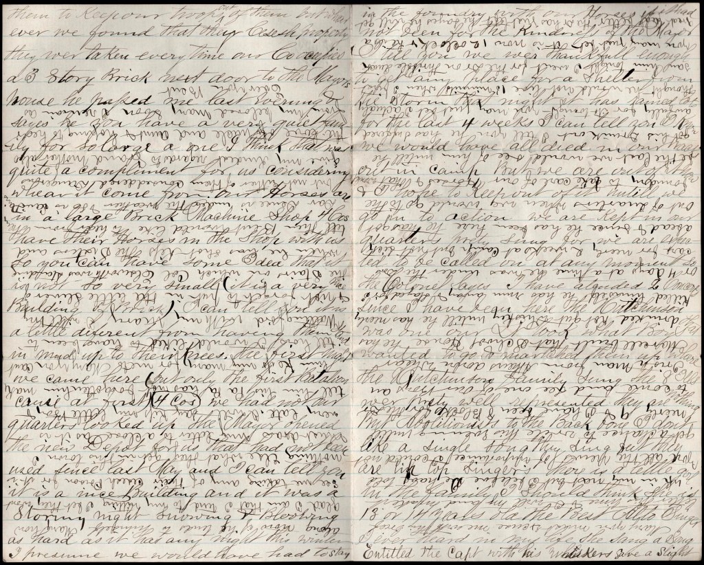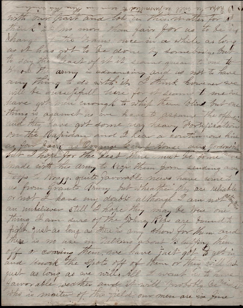 He—this conductor—told me to get a pass from our colonel & come over to his camp some day & he could get a pass from Mac that would take us anyplace in & around this place or any other place. He used to know Mac in Chicago for Mac used to be in the railroad business there & he says he is not afraid to ask a favor of him. I am going to try it someday when I can get away just as well as not but don’t know when that time will come. I have not had the pleasure of seeing it since I have been here for it is fix this & fix that, & do this & do that the whole of the time. I get tired of it. It seems as though we were never going to get regulated in camp in the world but it has been awful muddy all the time since we have been here. It is mud & rain, they say, here all winter instead of snow. If so, I tell you it is going to be awful this winter for it is middling level ground where our camp is & it will be horrible for it is mean to drain. We have to dig drains behind our horses for they stand in front of our tents and they have to be kept just as neat as if they was in a stable without 1 sprinkle of bedding & they be. My horse ran away with me last night coming from water. I ran into another man with two horses & it stopped him. I did not get hurt any but it hurt the other man some—not bad though. I have not got any bridle yet so he got the start of me. I will get one now for the farrier said I need not take him outside the guard unless they furnished me one for it was running the risk of my life as well as the life of others.