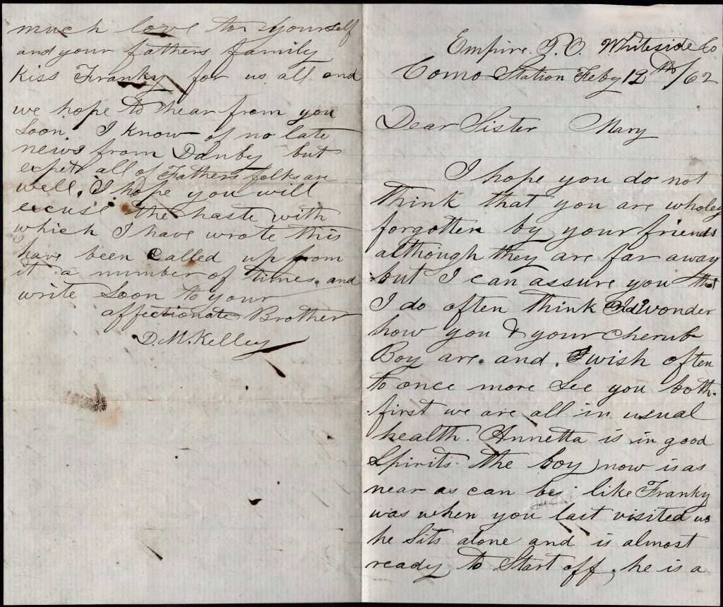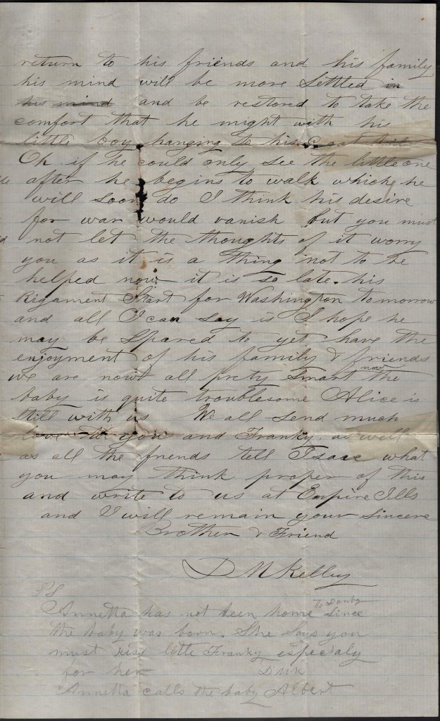 Now, dear Sister, a few words to you. I suppose you are weighed down with grief at the thought of Benton’s going to war, but I suppose that we cannot any of us help or hinder him. I went and saw him and gave him what instructions and encouragement as I could and I sincerely hope that should he be lucky enough to return to friends and his family. His mind will be more settled and be restored to take the comfort that he might with his little boy hanging to his coat tails. Oh, if he could only see the little one after he begins to walk which he will soon do, I think his desire for war would vanish. But you must not let the thoughts of it worry you as it is a thing not to be helped now. It is too late. His regiment starts for Washington tomorrow and all I can say is I hope he may be spared to yet have the enjoyment of his family & friends. We are now all pretty smart now. The baby is quite troublesome. Alice is still with us. We all send much love to you and Franky as well as all the friends. Tell Isaac what you may think proper of this and write to us at Empire, Illinois, and I will remain your sincere brother & friend, — D. M. Kelley