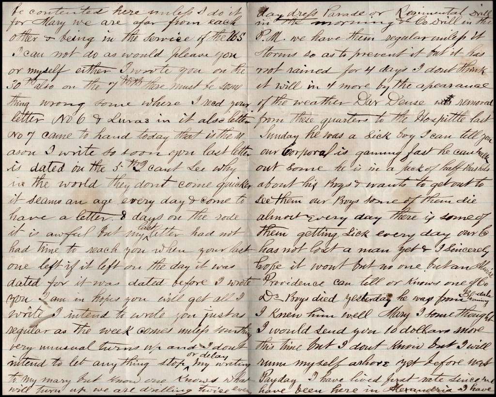 Mary, we are to move into Virginia next week into barracks about 5 miles from the City of Alexandria. Our colonel was over on Sunday last to see the place. We are to get our arms & pay before we leave, or he says he will not move us one peg for it is now almost 3 months since we have been sworn in (just 3 months tomorrow since Capt. Kelley was sworn in) & we have not got a cent from the government yet. Every few days there would be a rumor in camp we will surely get our pay this week anyway & so it has been ever since we have been in Washington. But I guess it is drawing pretty close at hand for our colonel is just as good as his word—or at least always has been. I know we will not be budged from this ground until we get our pay & arms. There has been over 50 regiments of men moved across the Potomac within the last 10 days. Not a single day passes but what we can see some regiment on the march.