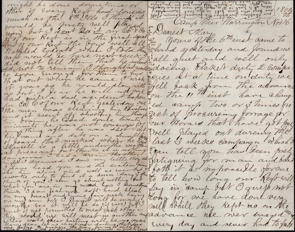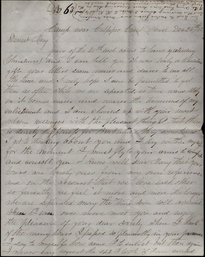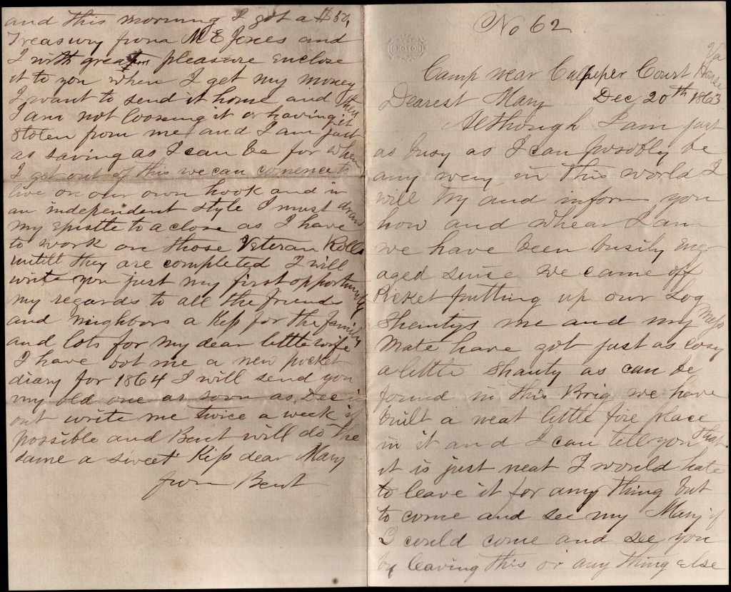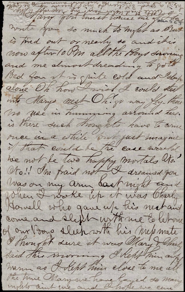 I have devoted the most of my time helping Uncle Elisha fix his tent so it would be comfortable for him these cold nights for it is awful cold weather nights. The days are mild for this season of the year, but the nights are shocking cold. Oh, Mitty, would I not like to have you lay on my arm once more. How many times I think of it when I get my blanket spread out for the night, how you & Bent used to get in bed together & how you used to think you could not go to sleep unless you laid on my arm. Mary, how do you get along without your good night kiss? I wish I could give you one more. God spare my life to bring me to your welcome bosom. Mary, I have not had as good a night’s rest in the whole three months you have been gone as I did in one week when you was in bed with me & I don’t think I would have a decent night’s rest if I was away the whole three years. I never have shut my eyes to rest a single night since I have been in the service without thinking of my dear Mary & boy. Mary, it would be good for me to have the pleasure of being in your dear society. Sometimes I think I would give all I had in the world if I could see you & talk with you for just 5 minutes. But Mary, I just think that would be only an aggravation for we would have no time at all in 5 minutes, would we Mary? But dear girl, be of good cheer, & try all you can to enjoy life and the society of your friends all you can, for dear girl, I don’t want to think that you are in as limited sphere of life that I am, for I am wholly & totally to the say of others. While you are your own mistress.
