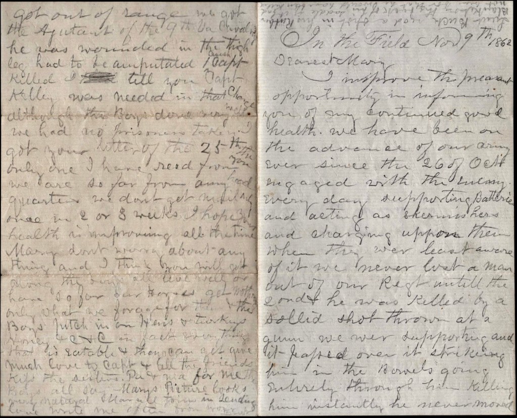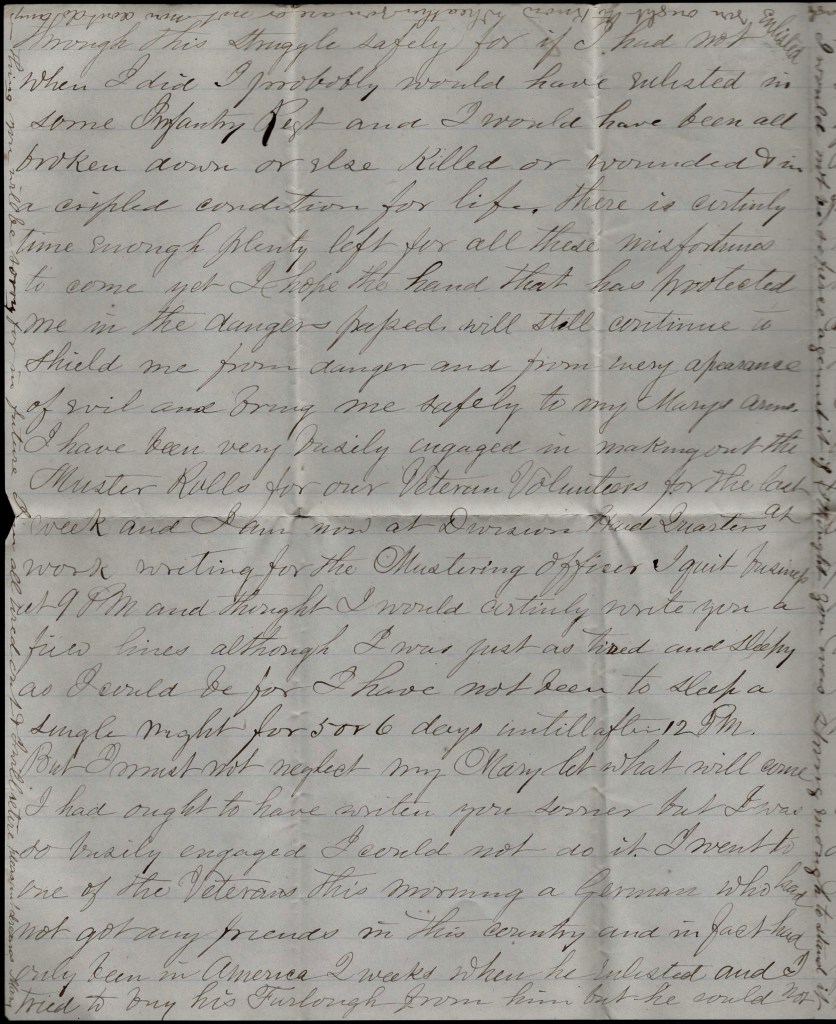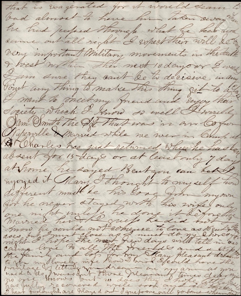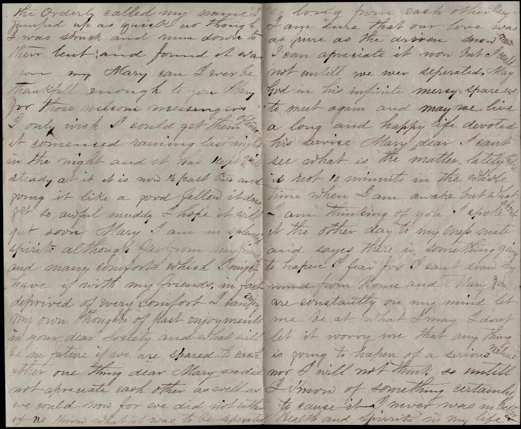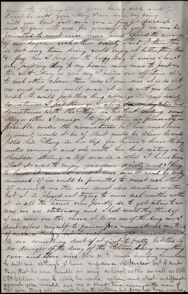 Mary, very many I dare say that have thought they loved with the same fervent and pure love that we do and have thought that ere another month should pass would be safely in each other’s arms, that have been called to meet their God. Let us pray for the protection of that Kind Providence that has ever watched and guarded us through the dangers of the past and let our prayers be unceasing and from our inmost souls. Then I doubt not that we may be restored to each other’s arms to spend the few remaining days we have to remain on this earth in the enjoyment of each other’s society. Then, then I am sure we cannot but praise Him for our past blessings. How thankful, dear Mary, I am that I have been protected this far through all the dangers of the field of battle and from the prevailing diseases of a camp life. I sometimes think that were I to devote the balance of my time in fervent supplication to Him who has bestowed this blessing, I could not repay for them. But I trust I may if my life is spared and I am sure Mary will help me to do it (I hear you answer from my very soul).