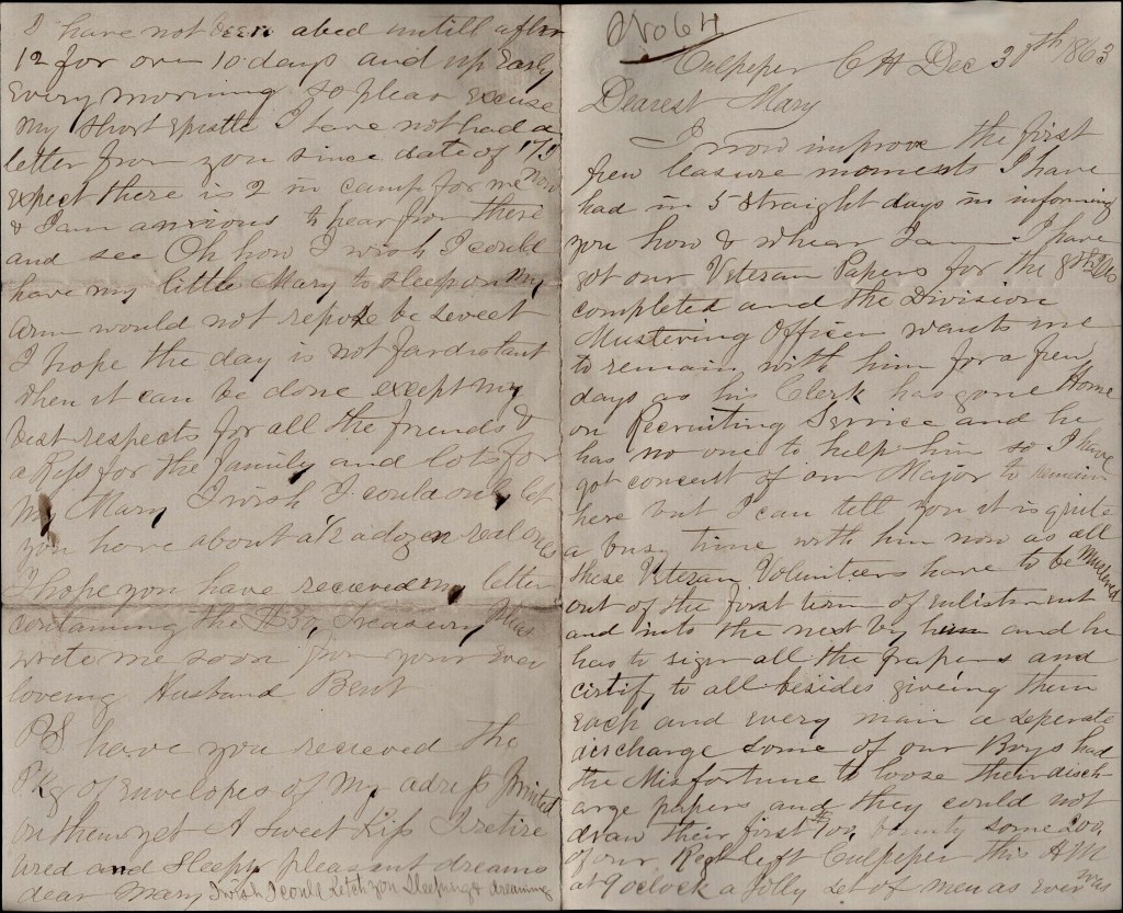 There is a battalion of our regiment here (four companies) and Capt. Buck commander of the whole thing, acting Major. I think this will be the last letter I will write until we go to Washington to either be mustered out or go to Illinois. Col Farnsworth has not got back to Washington yet & so I have not got a definite answer in regard to where we will be mustered out, but our colonel says we will be mustered out and paid in Washington. I only wish I could believe it. I fear I am too anxious to come to Vermont to have the privilege granted. You well know I want to see my father & mother, but my Mary is first and the well beloved of my heart. It is her I now forsake all to love and cherish and I only wait for the blessed moment that will make us the same as before. Is there not pleasure in the thought that if our lives are spared we can once more enjoy the society of each other. You are my all, dear one, and it is for your own enjoyment I want to be spared to you for I know so well I am capable of making you so happy. Much love to all the friends and a kiss for the family and that loving and devoted kiss for my little wife. You only write one more letter and that the next mail, sending 2 more photographs. Your own, — Bent