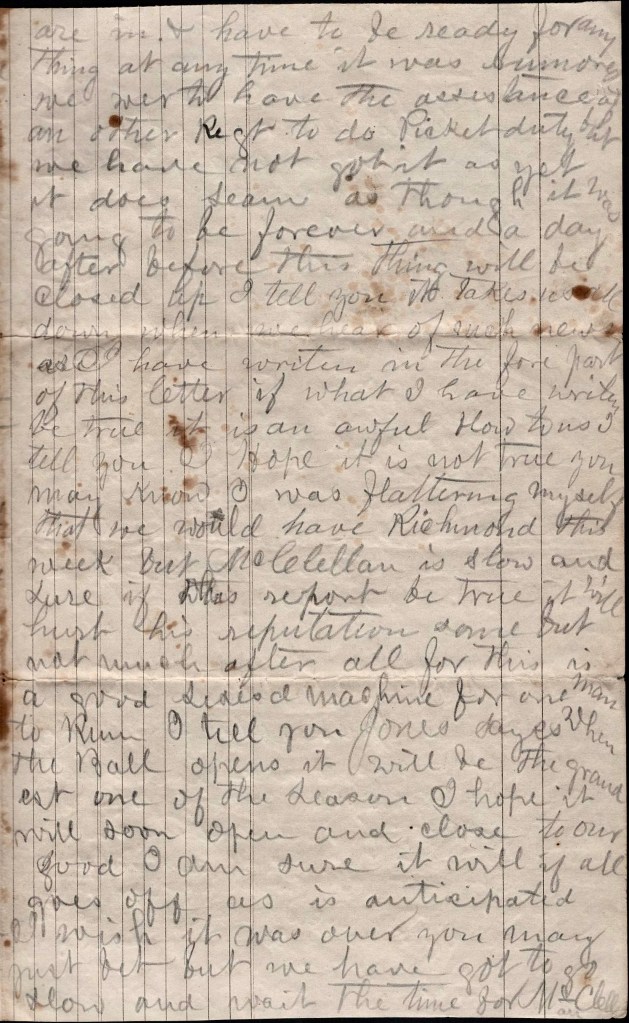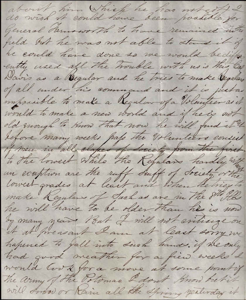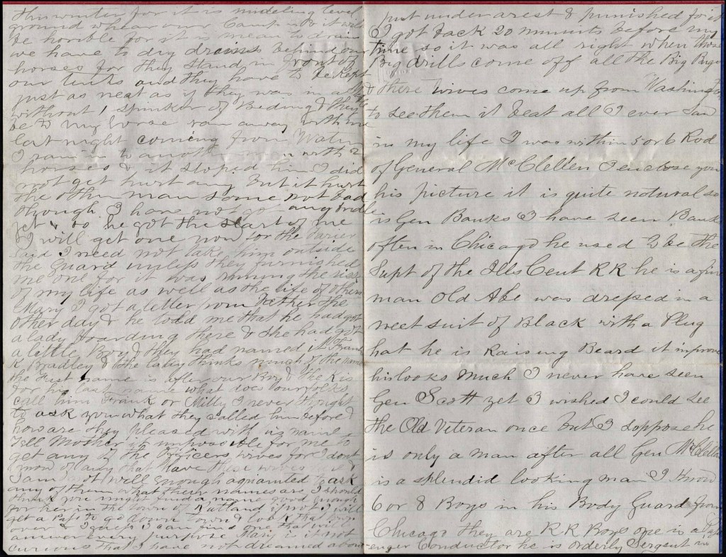 When those big drills come off, all the Big Bugs & their wives come up from Washington to see them. It beats all I ever saw in my life. I was within 5 or 6 rod [@ 30 yards] of General McClellan. I enclose you his picture. It is quite natural. So is Gen. Banks. I have seen Banks often in Chicago. He used to be the Supt. of the Illinois Central Railroad. He is a fine man. Old Abe was dressed in a neat suit of black with a plug hat. He is raising beard. It improves his looks much. I never have seen Gen. Scott yet. I wished I could see the Old Veteran once but I suppose he is only a man after all. Gen. McClellan is a splendid looking man. I know 6 or 8 boys in his bodyguard from Chicago. They are RR boys. One is a passenger conductor. He is orderly sergeant in one of the companies. I had just left the field where they was drilling the other day when I saw McClellan & the rest. I was strolling along afoot & this conductor spoke up & says, “Kelley How are you?” I looked around & I saw who it was that spoke & I did not recognize him the first time that I looked, & I went up towards him & says I, “Is this George Gardner?” and he said it was. He has left his beard [&] mustache grow so it covers his face all up. He was in Western Virginia with McClellan in Barker’s Dragoons at the time Mac got his name up for Mac distinguished himself as a military man since this rebellion broke out in Virginia.