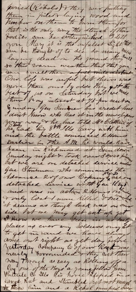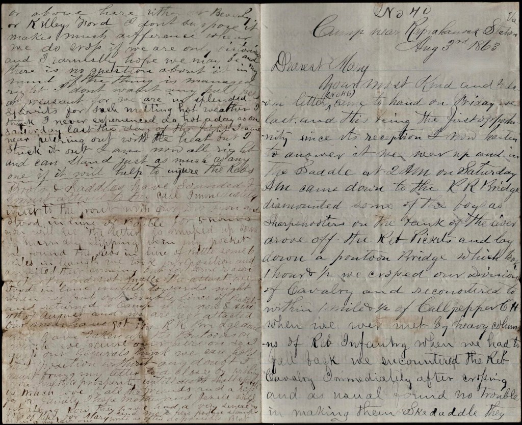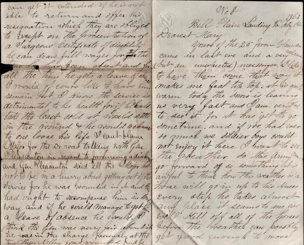 The Rebs made sad havoc in my-Maryland in the last few days, but last eve’s paper states they are all safe across the Potomac again. I am in hopes they will all be captured yet. One thing is [certain], the Army of the Potomac is not there or they would not many of them report to Jeff Davis & Co. at Richmond, Va. I don’t think Grant had any idea how many of them there were, or he would have sent some more than he did, for he only sent one Division of the 6th Corps in season to do any good. What he sent away last, did not get there in time to confront the enemy. The 8th Illinois [Cavalry] was engaged from the outset and I understand were cut up some. The man I love so dearly—Lt. Col. D. R. Glendenin—was wounded. I hope he was not seriously for I can get my little satisfaction out of him and let him enjoy the blessings and comforts of life afterward. But enough of this. All will come out right, I hope. I have not heard how Co E got along or what their loss was—if any. Hope not severe. But troops in cases of that kind fight very desperate and inevitably must lose some.