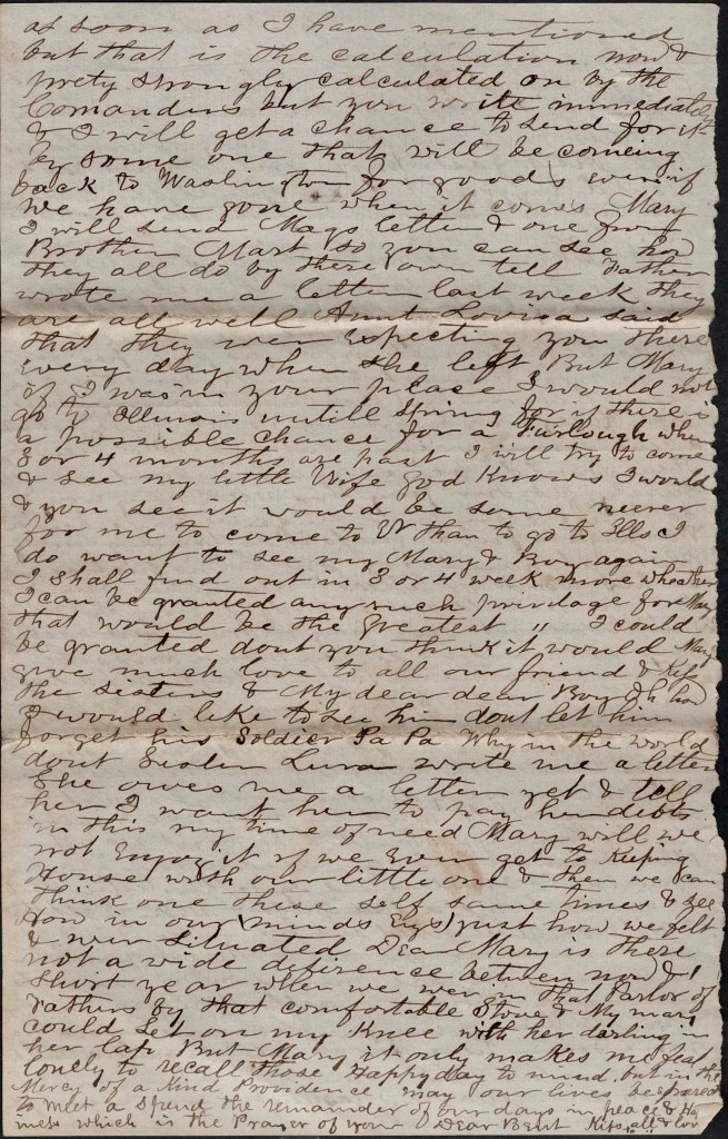 Father wrote me a letter last week they are all well. Aunt Louisa said that they were expecting you there every day when she left. But Mary, if I was in your place, I would not go to Illinois until spring for if there is a possible chance for a furlough when 3 or 4 months are past [and] I will try to come & see my little wife. God knows I would & you see it would be some nearer for me to come to Vermont than to go to Illinois. I do want to see my Mary & boy again. I shall find out in 3 or 4 week more whether I can be granted any such privilege for Mary that would be the greatest I could be granted, don’t you think it would.