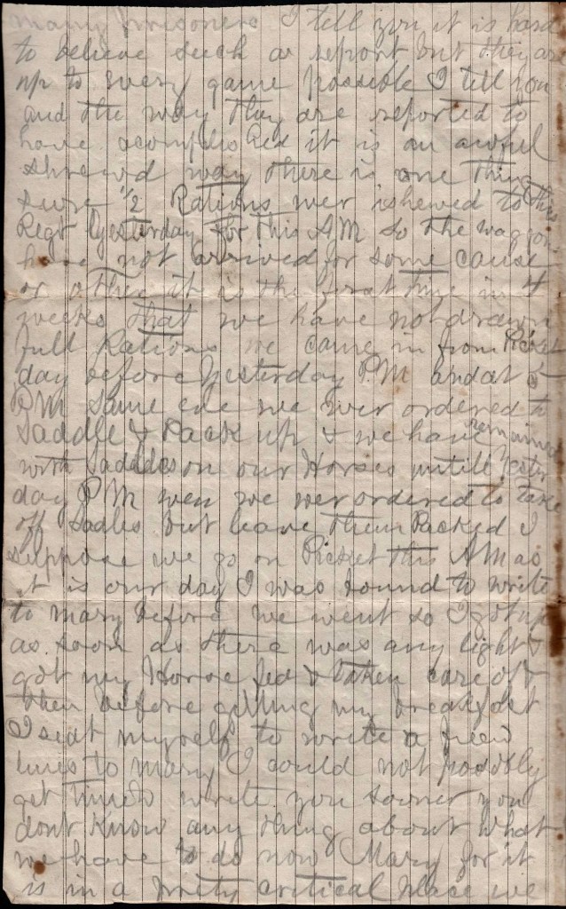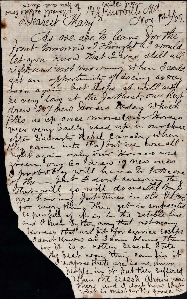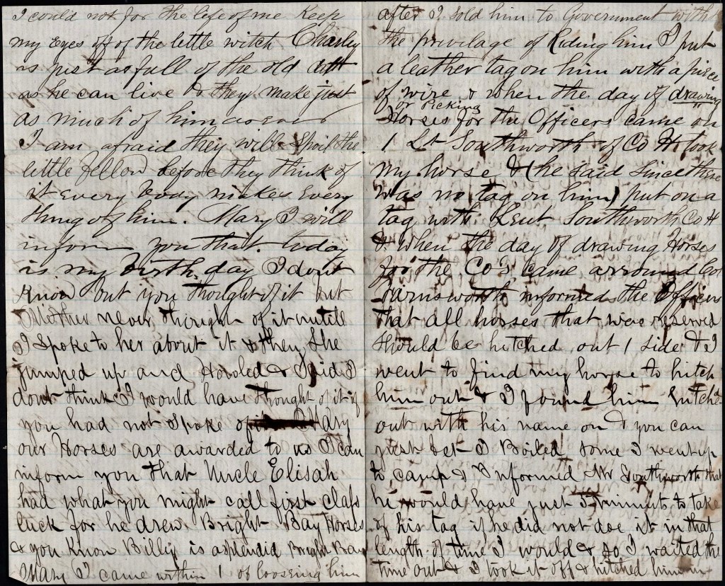 Mary, I will inform you that today is my birthday. I don’t know but you thought of it, but Mother never thought of it until I spoke to her about it & then she jumped up and howled & said I don’t think I would have thought of it if you had not spoke of it. Mary, our horses are awarded to us. I can inform you that Uncle Elisha had what you might call first class luck for he drew bright bay horses & you know Billy is a splendid bright bay. Mary, I came within 1 [inch] of losing him. After I sold him to the government with the privilege of riding him, I put a leather tag on him with a piece of wire & when the day of drawing horses or picking for the officers came on, 1st Lt. Southworth of Co. H took my horse & (he said since there was no tag on him) put on a tag with Lieut. Southworth, Co H, & when the day of drawing horses for the companies came around, Col. Farnsworth informed the officers that all horses that were reserved should be hitched out [to] one side, & I went to find my horse to hitch him out & I found him hitched out with his name on & you can just bet I boiled some. I went up to camp & I informed Mr. Southworth that he would have just 5 minutes to take off his tag if he did not do it in that length of time, I would. And so I waited the time out & I took it off & hitched him in with Uncle Elisha’s horses. When the man came & said if that horse belongs to you, of course I will relinquish my claim on him. Says I, you have not got any claim on him, & he whirled on his heel & left, & I have got my horse.