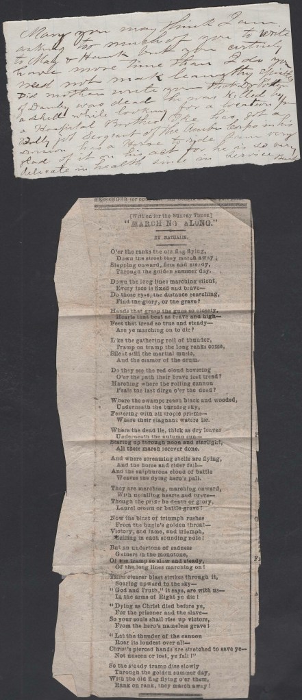 Mother has been out to see Mart’s folks. I got a pass for her out & back. She said Annetta was quite sick but was a little better when she came away. She says little Julia is just as smart a girl as ever lived. But Mary, that won’t be no name for our family when they are as old as Julia is (do you think so?). She is smart, I am willing to acknowledge, but when you come to get 2 as smart folks as you & me together, the second generation takes the rag off (but enough of this).