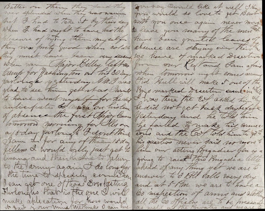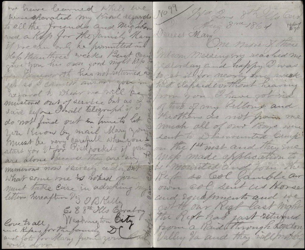 My kind regards to all the friends and neighbors and a kiss for the family. Mary if we can only be permitted [to love], in less than three weeks Bent can give you his own good night kiss. Gen. Farnsworth has not returned as yet so I cannot answer you in regard to where we will be mustered out of service but as I said before, I will telegraph if I do not find out in time to let you know by mail. Mary, you must be very careful when you start for Vermont for pickpockets if you are alone because they are very numerous now. Scarcely a day but what someone is robbed. You must take care in addressing my letters hereafter. Viz: T. B. Kelley, Co. E, 8th Ills Cavalry, Washington City.