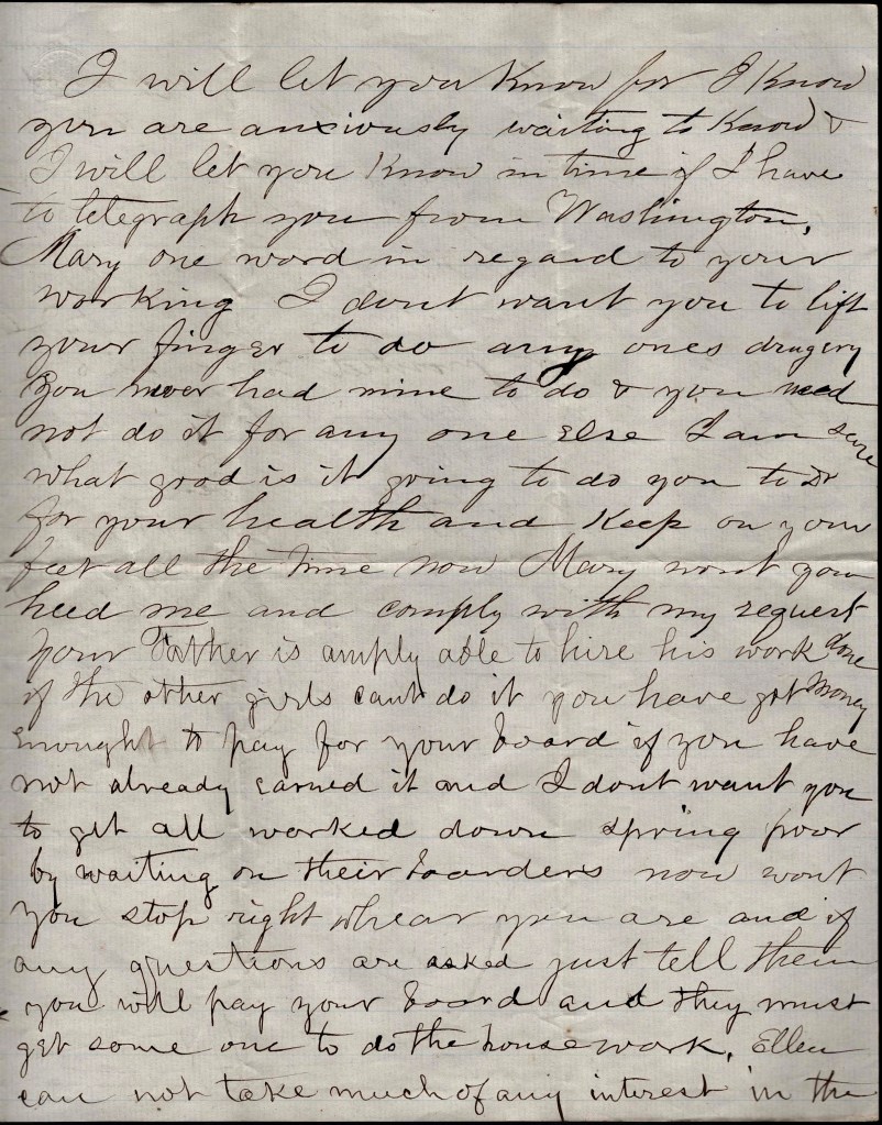 You will tell him to not blame me for not writing to him but every day has brought its cares and having so much sickness in my own, I have neglected writing to him when I should have done it. Should he not get any money from Father, let me know and I think my name will be good to borrow and send him, for it is when a person is sick that they need and if ever they do.