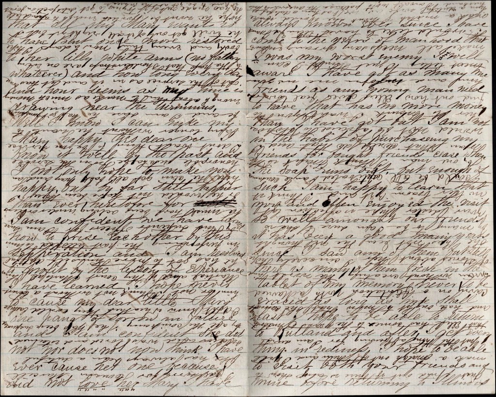 Well, I know I can make my Mary happy. Yes dear, one know it well by the past and I not only hope to make you happy, but by far still happier than ever, heretofore for I am confident we have learned how to prize each other by this separation and I am resolved to profit by the lesson of experience. I have learned, I hope, never to cause my dear little Mary one pang of sorrow in future and I am confident she did not nor does not now think I have ever cause her one because I did not love her.