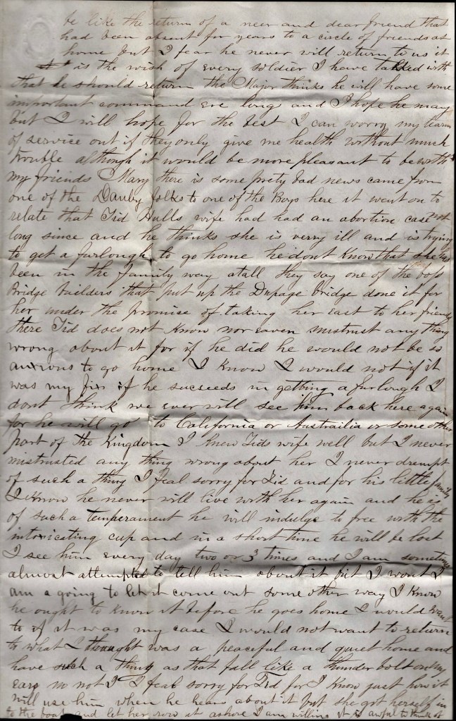 Mary, Father says Mother & him & the cat constitute his family circle. He says he has the blues the tallest kind once in a while. He says he misses Bent more than he thought he would & I guess he don’t lie a word when he says it either for Mary you know many times I was left entirely alone to tend house & Station & all & it was done up in as good style as it would have been done if he had been there himself & took a good many extra steps for him in the course of 24 hours. And I know he has not got anyone that took them with as good cheer as I did. Judd wrote me the other day that almost everyone that come to the Station asks him where Bent is gone to the war (yes in a pigs ass, they say). They don’t think I have gone & he says they wont half of them believe it anyway. But when the fall grain begins to come in there at the Station, I guess they will believe it then. Judd says they are doing considerable now. I wish I could pop in & see how they go it. I bet it would be fun. Mary, I can imagine myself there now & my little Mary looking out of the parlor window with little Franky on her knee. I wish it was really so. But alas, dear girl, we are far apart trusting to a kind Providence to preserve our lives to meet & pass the remainder of our days in happiness & love. Dear Mary, will we not!!!