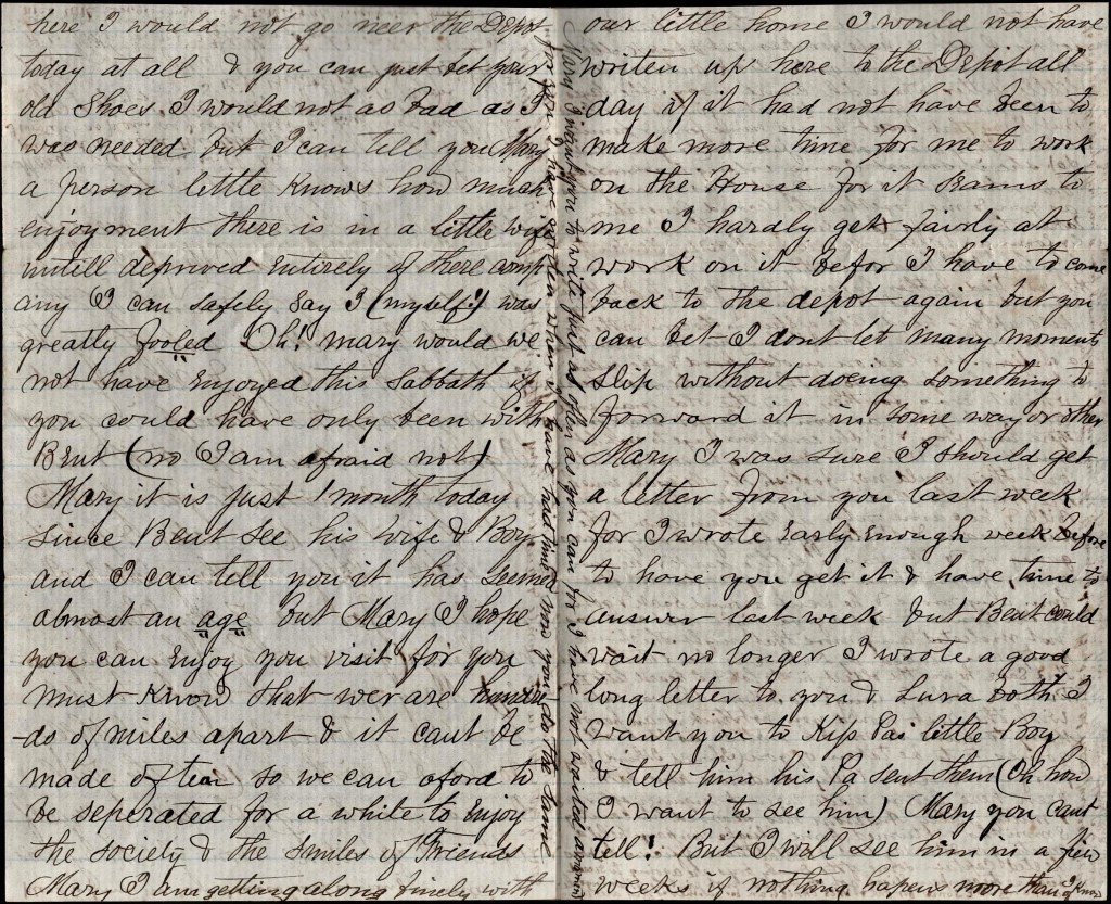 Mary, it is just a month today since Bent seen his wife & boy and I can tell you it has seemed almost an age. But Mary, I hope you can enjoy your visit for you must know that we are hundreds of miles apart & it can’t be made often so we can afford to be separated for awhile—to enjoy the society & the smiles of friends. Mary, I am getting along finely with our little home. I would not have ridden up here to the Depot all day if it had not been to make more time for me to work on the house for it seems to me I hardly get fairly at work on it before I have to come back to the depot again. But you can bet I don’t let many moments slip without doing something to forward it on some way or other.