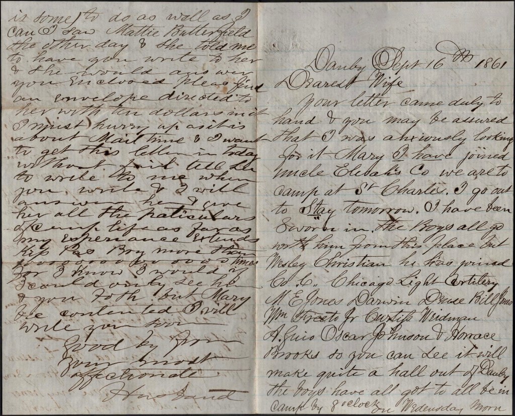 Your letter came duly to hand & you may be assured that I was anxiously looking for it. Mary, I have joined uncle Elisha [Kelley]’s company. We are to camp at St. Charles. I go out to stay tomorrow. I have been sworn in. The boys all go with him from this place but Wesley Christian. He has joined Co. C, Chicago Light Artillery.