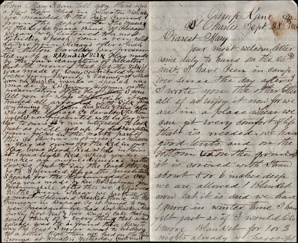 Mary, how I wish you could have been here yesterday & seen our company left camp for Wheaton. Our company & the Bloomingdale company had an invitation to the Fair & I tell you, we had fun till you could not rest. The boys all felt so good to think they was all going to have 1 day when they could enjoy themselves & see their friends. We formed company & marched from St. Charles to Geneva, a distance of two miles where we found the cars ready to take the soldiers in. We got in & in 48 minutes we were in the city of Wheaton where we got out & found all of our friends waiting with anxious eyes (except Mary) to see us, for I presume not more than a dozen soldiers in the two companies but what had friends looking for them. Mary, I can tell you there was a few tears shed in Wheaton yesterday. We marched to the Fair Ground from the depot after the music of the Light Guard Band of Chicago where we listened to a most patriotic speech from a very noted lawyer from Chicago, after which the Milton Cavalry were presented with a splendid silk flag made by the fair daughters of Wheaton. But the money that bought the silk it was made of was contributed by all folks from Danby & vicinity, as well as from our Wheaton friends. A speech was made by Lt. Governor Hoffman on the presentation of the flag. Mary, I can tell you it was splendid. Tt was trimmed all around with silk fringe containing three colors—Red, White, & Blue, after which the Dupage Co. Cavalry (the Bloomingdale) was presented with a flag similar to ours & was intended to look just as well, got up by subscription from folks in the north part of this county. It was not near as handsome a flag as ours for the red in our flag was blood red while in theirs, it was light red which you see makes an awful difference in the looks. But to say the least, they are both splendid flags. The presentation speech for the Bloomingdale Co’s flag was made by Rev. Mr. Chapman from Bloomingdale.