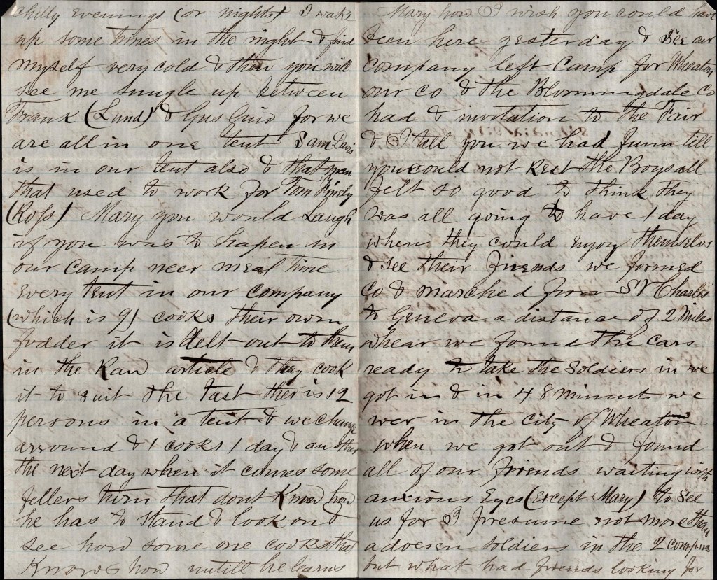 Mary, just enjoy yourself in every way, shape, & manner possible for you so to do, for Mary, I know you would say the same if you was situated the same as I am. Mary, you wished to know if you would be allowed to visit me if I was sick. I am sure you would, but Mary, my health is on the gain. I begin to feel in good health & spirits. We are getting better rations than we used to get & we have got a colored cook that cooks for the whole company. He is a very good cook & I have got so I can eat his victuals first rate & I am sure to be around when it comes meal time for we are marched to the table the same as we are out to drill. There is 9 tents in our company & there is 9 corporals, so there is a corporal in every tent. He is boss of all hands. Our little corporal is from Wheaton. He has got the idea in his head that he was cut out for a Capt. or a Lt. or some other great military officer, but if [he] has the best kind of luck, he never will get up as far as that unless he alters his gait for he is of too much importance for the office he now holds. If I had enlisted at the time I wrote to you first about it & not waited for an answer from you, I would have got some little Sh____ office, but it is just as well after all for they don’t amount to a row of pins any way.