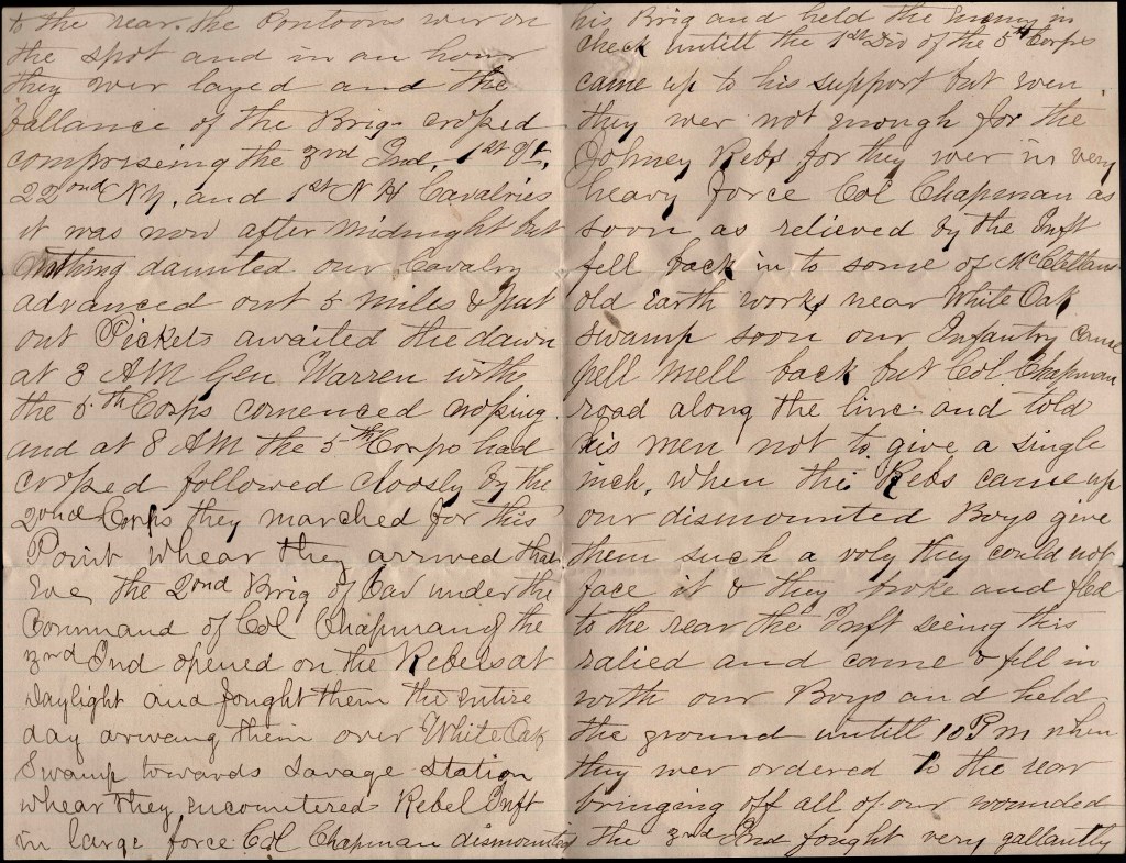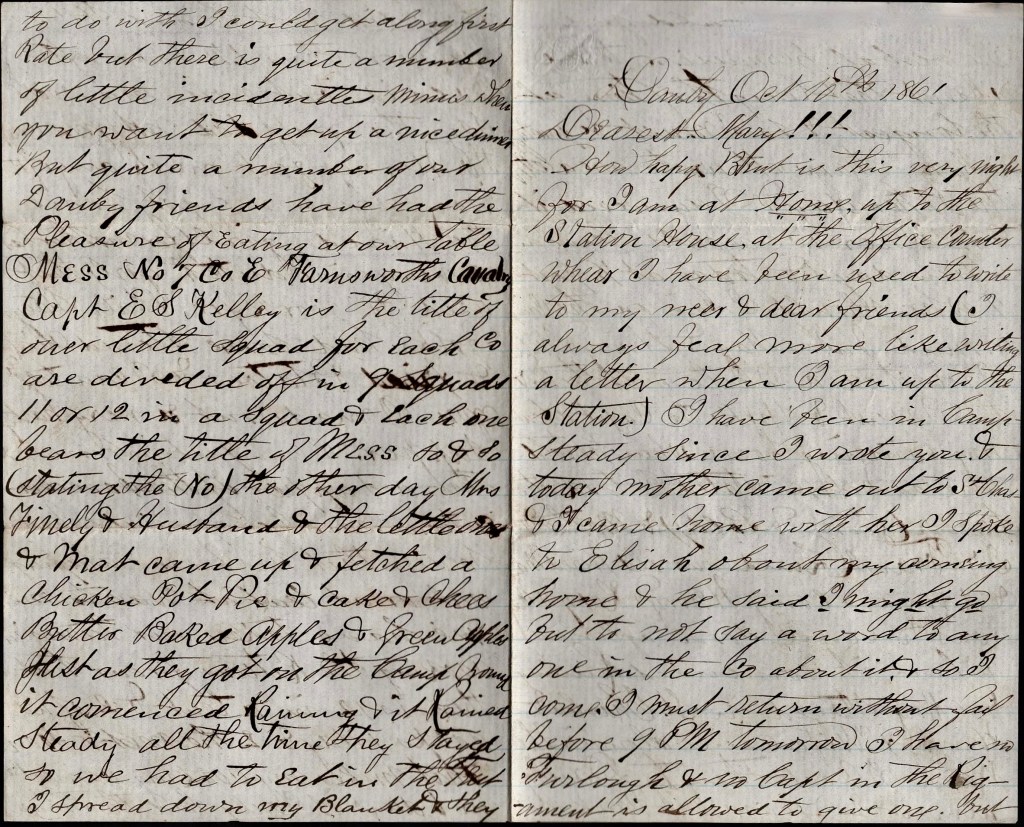 We have taken our turns in cooking the rations for our tent. There is 12 in a tent & 2 of us cooks 1 day & 2 the next & so on. That makes my cooking come once in 6 days. If I only had the things to do with, I could get along first rate, but there is quite a number of little incidents minus when you want to get up a nice dinner. But quite a number of our Danby friends have had the pleasure of eating at our table, Mess No. 7, Co E, Farnsworth’s Cavalry, Capt E. S. Kelly is the title of our little squad, for each company are divided off in squads, 11 or 12 in a squad & each one bears the title of Mess so & so (stating the number). The other day Mrs. Finely & husband & the little one & Mat came up & fetched a chicken pot pie & cakes & cheese, butter, baked apples & green apples. Just as they got on the camp ground, it commenced raining & it rained steady all the time they stayed, so we had to eat in the tent. I spread down my blankets & they spread the victuals on it. Now I can just inform you, if ever a meal of victuals ever tasted good, it was on that memorable day for I can tell you I enjoyed it, [even] if it did rain.