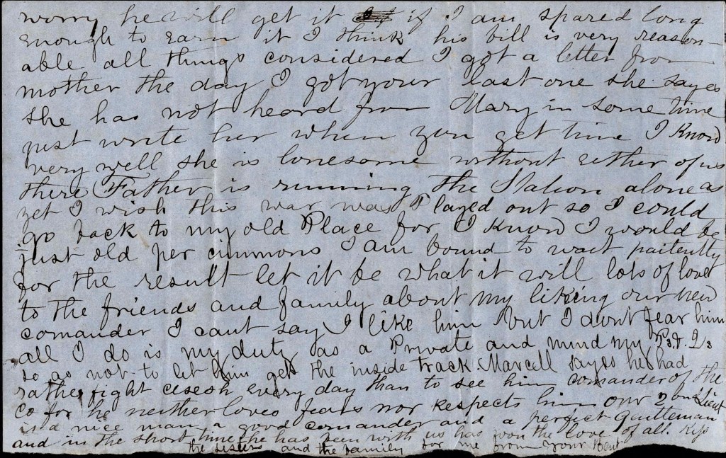 I am sorry for Cousin Marcell [Jones]. He has always been a dutiful soldier and was loved and esteemed by all the company if he has been suspended. I don’t know whether they could cashier him or not. I think not without a court marshal, and if they court martial him, he has got to prove himself dutiful in performing the part allotted to him by his superior officers for I am sure he must have been acting under orders or he would not have been there. I hope he can get all back pay and an honorable discharge from the service. I don’t want him to be in service any longer without he wants to be and I am sure he has got gumption enough about him to make as much money out of the service as in it and it has come to the pass that shoulder straps are on everybody and everything now a day. I hope he will get out of it all right yet, but I hope he won’t be foolish enough to spend all he has made out of it trying to get satisfaction for it is hard to be got at the [ ].