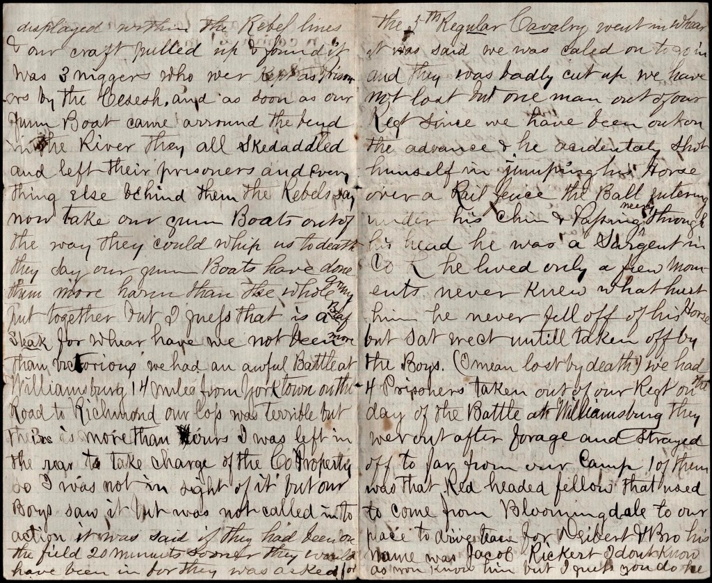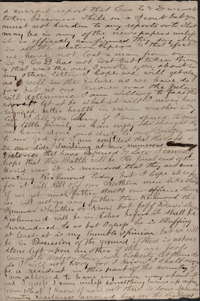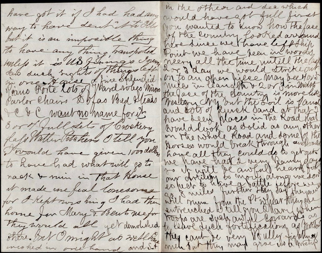 Last eve I received yours of the 23rd. I had been looking for it for two or three days and it at last came. We have moved our headquarters across the Suffolk Railroad some 12 miles from Light House Point. We left our camp at that Point this a.m. at 7 o’clock. We have got a miserable place out here—nothing but dust and devastation in its worst forms. The general took the two divisions and crossed the James River in conjunction with the 2nd Army Corps. They were engaged for two days. They captured 4 siege pieces & 3 caissons & 80 or 90 prisoners & killed & wounded quite a number more. Our loss was slight in the infantry & cavalry both. The command moved across the river on the eve of the 29th and had a cavalry fight near here & established headquarters and us fellows in the rear got here today at 12M. How long we will remain here is more than I can say but hope not long. It is such a horrible place.
