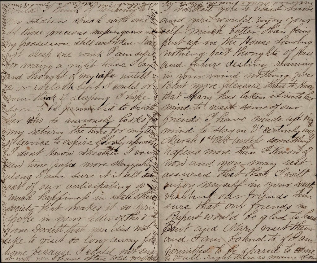 You spoke in your letter of the 3rd from Dorsett that you did not like to visit so long away from home because I could not enjoy it with you. I have often told you that I wanted you to visit more and you would enjoy yourself much better than being pent up in the house having nothing but thoughts of past and future destiny running in your mind. Nothing gives Bent more pleasure than to know that Mary has taken it into her mind to visit some of our friends. I have made up my mind to stay in Vermont, certainly until March 1st 1865 unless something happens more than I know of now and you may rest assured that I will enjoy myself in your society, visiting our friends. I am sure that our friends in Rupert would be glad to have Bent and Mary visit them and I am bound to, if I am permitted to be spared to come to Vermont all right. There is many of our relatives I would like to visit that I think would be happy to have us come, that I got no opportunity to visit when was home either the first or second time. I guess we will give them a sweater this winter on the visiting line if we are well and hearty. Now it is only 10 weeks from tomorrow and Bent can say he is free from the soldier bonds. May the time soon roll around. I sometimes get impatient for it to come although I have not fired a shot at a wild Reb this season and am not exposed to much of any danger. But I am tired of being in this business and separated so long from those I love.