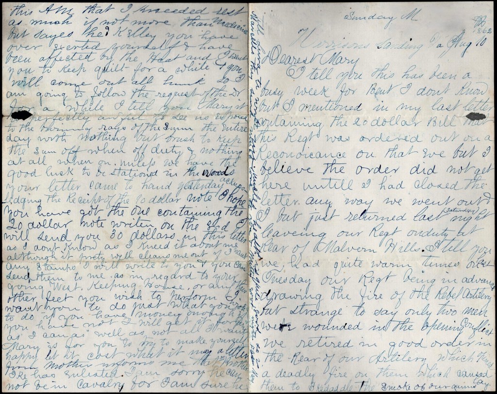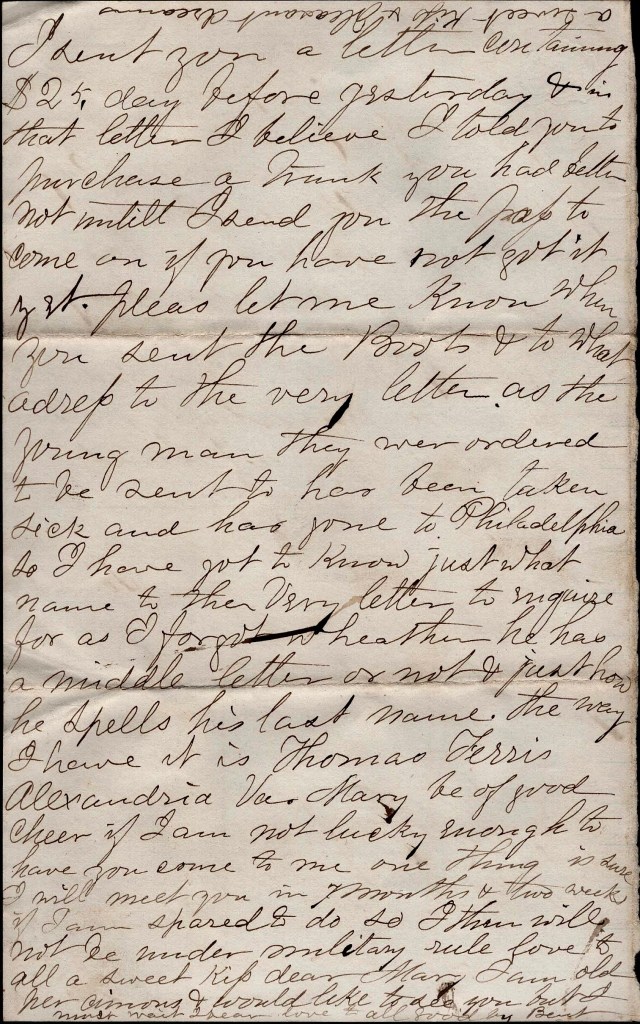 Mary, you wanted me to assure you I would refrain from some ______. I can give you my honor, I will try all in my power (& that is some) to do as well as I can. I saw Mattie Butterfield the other day & she told me to have you write to her & she would answer you. Enclosed please find an envelope directed to her with ten dollars in it. I must hurry up as it is about mail time & I want to get this letter in today without fail. Tell her to write to me when you write & I will answer her & give her all the particulars of camp life as far as my experience extends. Kiss Pa’s boy more than 10000000000000 times for I know I would if I could only see him & you both. But Mary, be contented. I will write you soon. Goodbye from your most affectionate husband.