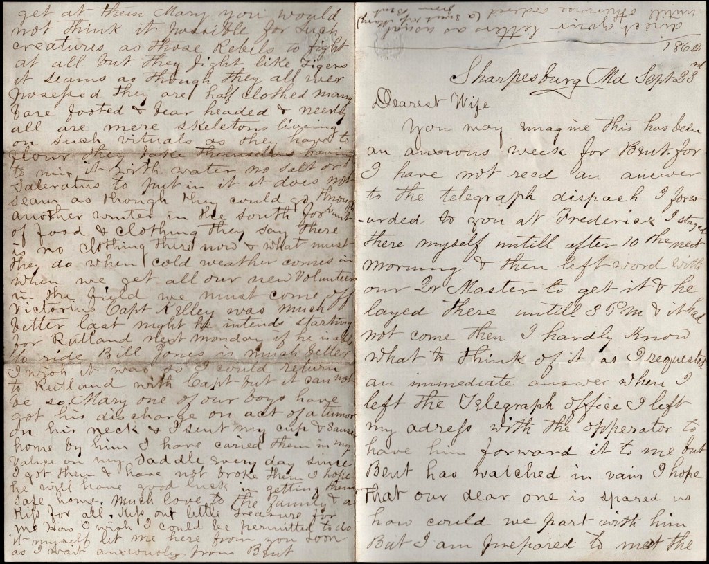 I wonder how the 8th Illinois Cavalry likes their Veteran operations. I see in last night’s paper they were engaged near Middleton, Maryland and near Frederick. I want them to have some hand in suppressing this Rebellion and now the Johnney Rebs are once more in Maryland, I am sure they will for all the troops that can be spared from the Capitol will be sent out to expel the invader from the sacred soil of the Union. I feel bad for the citizens of Maryland and Pennsylvania on account of they being robbed and plundered every year. But I think a good Rebel Raid up amongst some of the Copperheads of the North would arouse their Union sentiments some and the means of making decent men of them after being robbed of their all and burned out of house and home. I am confident that a good genuine Rebel Raid would do the thing up to the handle for I am sure nothing wound arouse their ire of anyone so quick as to see his own property going to waste in his own face and eyes. I would like to have the Rebs take a turn into Ohio and cool off some of those Copperheads there for there is not many in and along the border of Maryland and Pennsylvania. I am sure that not many of the [Rebel] army that has gone North will ever live to report to Gen. Lee at Richmond. It seems as though I could see every able bodied man seize his musket and come forward for the present time they are wanted—not when the invader is safely in his hole again. I await with calm patience the result of the next few days. May God protect the Right is the earnest prayer of your own husband.