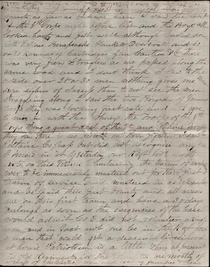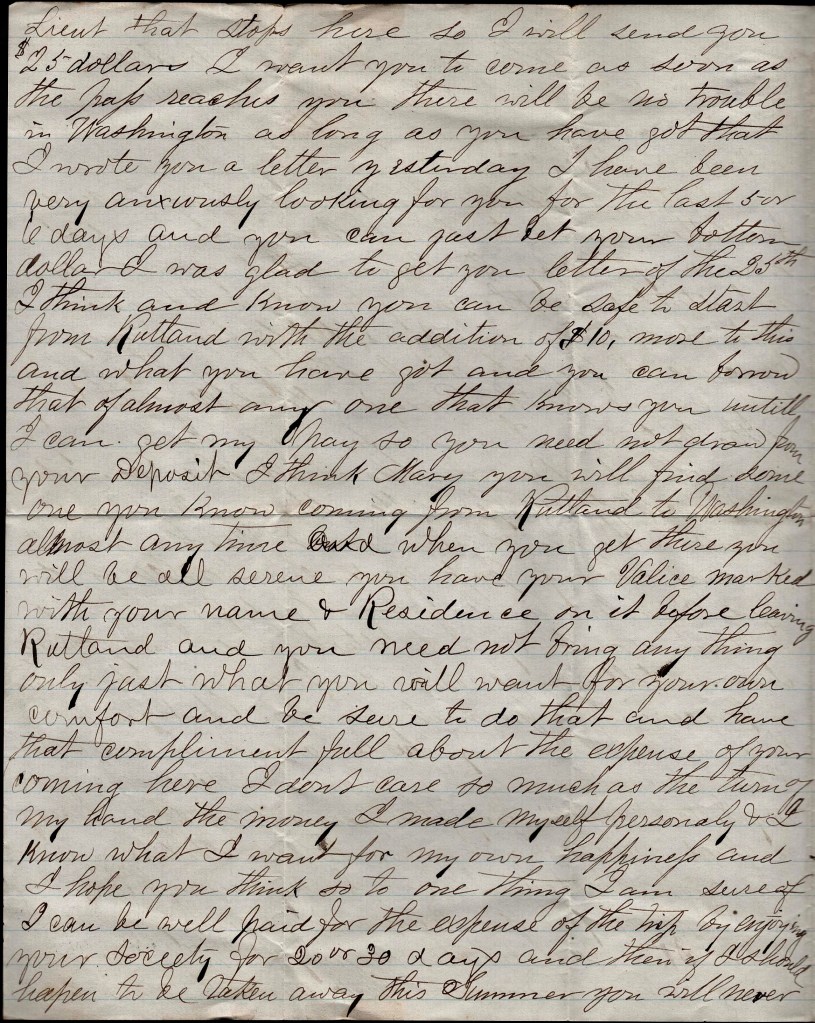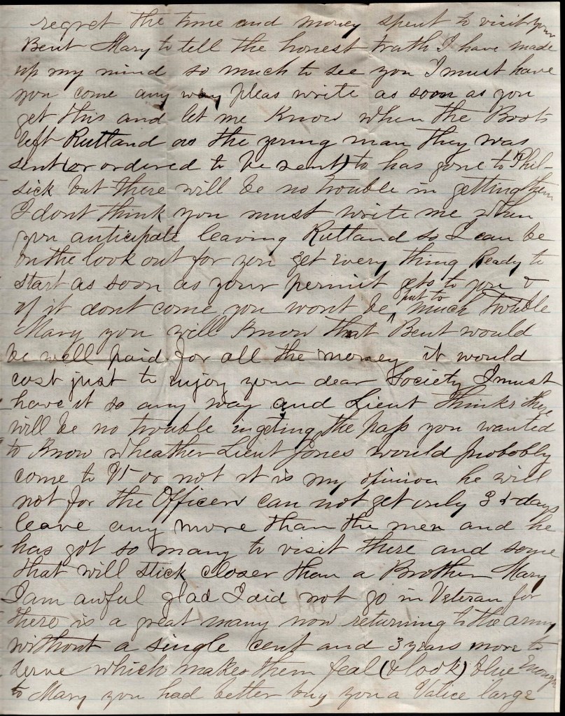 You thought you would not visit our friends in Middlebury until my return from the army, you can do as you think best. If it is in the power of possibles, I will come to Vermont before leaving for Illinois. I have heard 3 0r 4 officers say that we would have to go to the state to be mustered out. I don’t know but it is so. If it is, I must abide by it. If not, I will come to you for I want to come to Vermont and spend the fall and winter for I think I can afford to lay on my oars for 1 winter out of 4 and I know so well how welcome I think I would be amongst my friends in Vermont. You may just bet I will play my cards fine to get mustered out of service in Washington. If I think I can’t make it work, I will write you in season or if a letter will not get to you soon enough, I will let you know by telegraph for I am as anxious to meet you when I am a civilian as anyone could be another and if it can’t be done in Rutland, let it be done in Illinois.