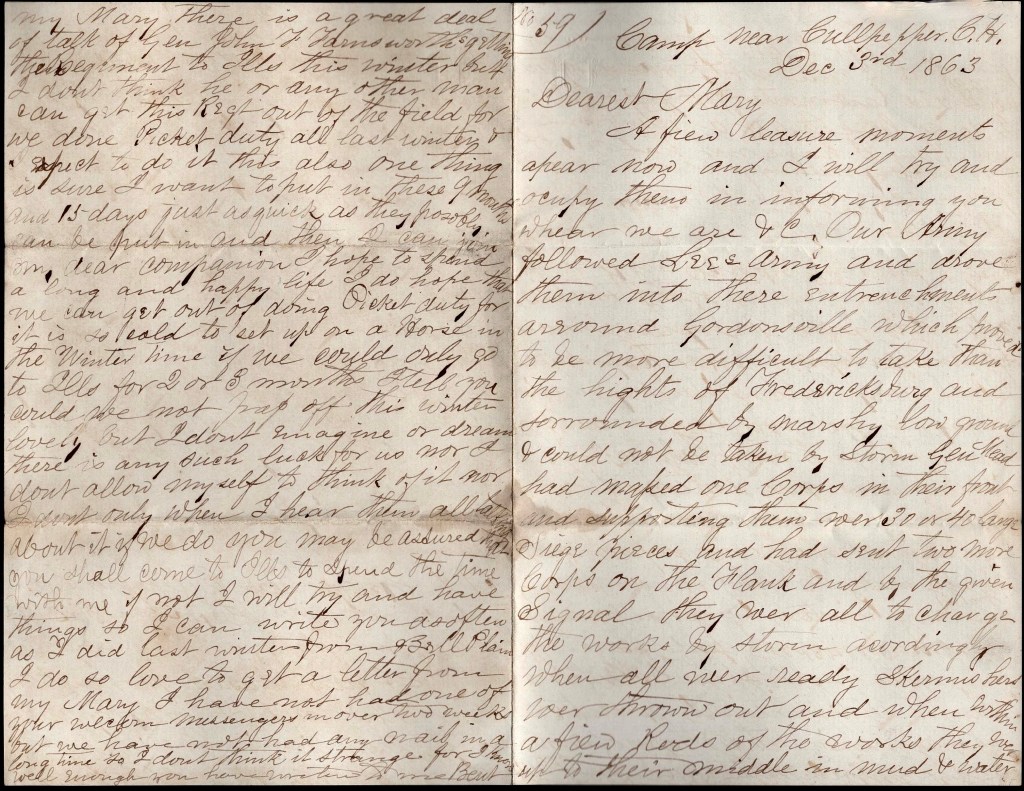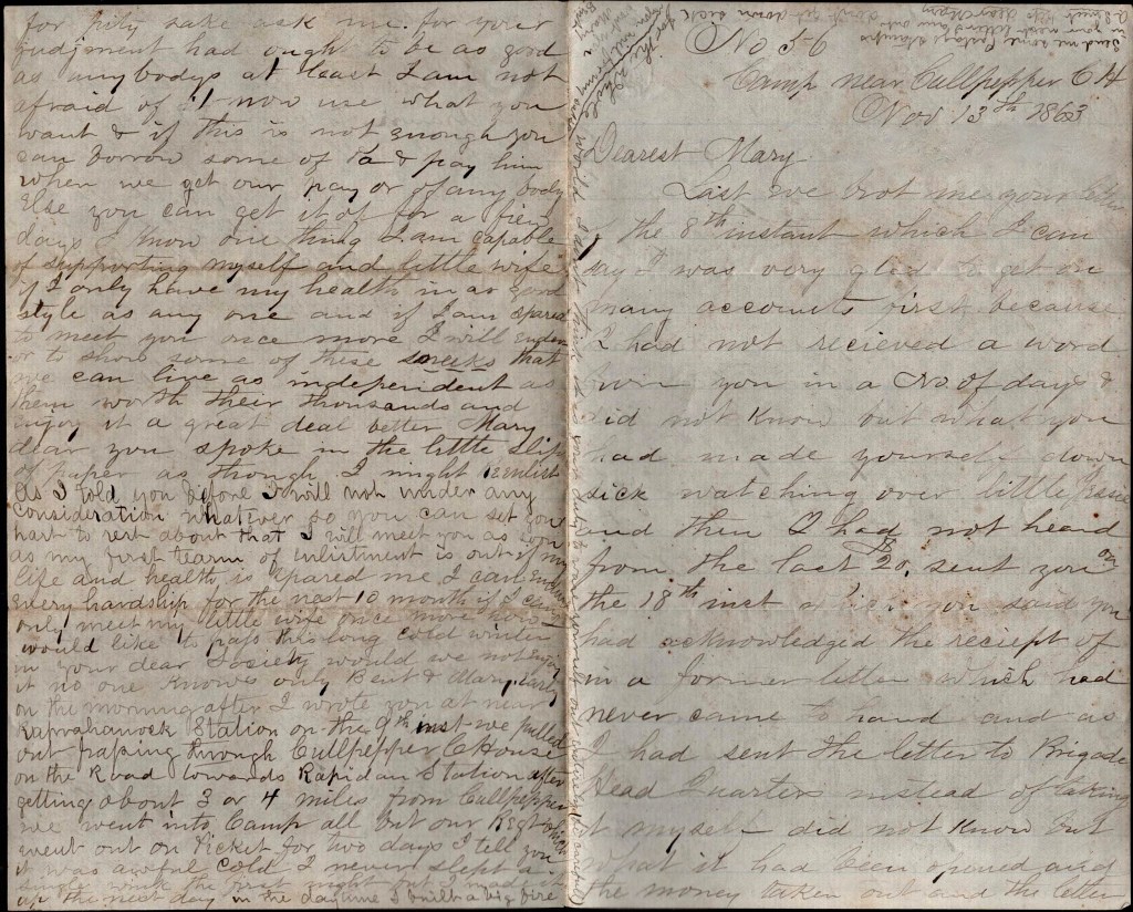 Mary, you have no idea how many men are in & around Washington. The leaves have pretty well fell from the trees & I can see tents in every direction & they look just like so many white cows in a drove & just as thick as they can stand. Last night we got another blanket & I can assure you, I lay much warmer, & I understand by Father’s letter that he has sent me a bed quilt. And when I get that, I will be quite fitted out for winter. I will let you know where you are to direct your letters as soon as we are moved but if you write immediately, which I earnestly hope you will, for I want to hear from you once more before we move from here, for it will be quite a while at the shortest, that I can here from you. Now Mary, don’t delay a moment as soon as you get this. It may be possible that we will not leave as soon as I have mentioned but that is the calculation now & pretty strongly calculated on by the commanders. But you write immediately & I will get a chance to send for it by someone that will be coming back to Washington for goods even if we have gone when it comes. Mary, I will send Mag’s letter & one from Brother Mart, so you can see how they all do by their own tell.