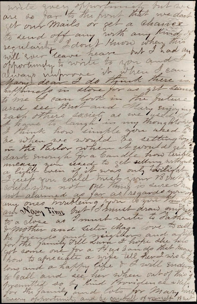 Mary, I get impatient sometimes to have the time pass swiftly by and hasten the time when Bent and Mary will be made the happiest of twain for I am well aware it will be the case when we meet. May a kind Providence guard and protect us and hasten the time when I can press my dear little wife to my breast as in days passed by. How happy was we then and did not know it. This war has learned many a one a lesson by experience.