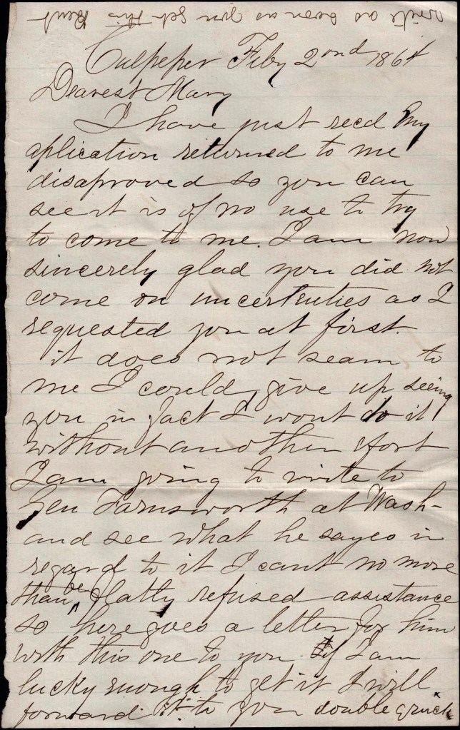 Again I seat myself to the pleasant task of writing to you and you may well be assured it is a pleasant one for Bent to perform. I received yours of the 16th inst. last eve and was glad to learn that you had had a good visit with our friends at Dorsett. I hope you did not leave there until you got your visit out for I am sure you had plenty of time to devote to that. I am pleasantly situated in writing you this letter—better than I have to write any one to you since leaving Culpeper. I have been ordered to Clerk for Dr. Dubois, Asst. Surgeon, USA, and Medical Inspector for the Cavalry Corps. I came to work for him this morning. He is a splendid man and the man that detailed me here is a nice man also. I do not know how long I will have to write for Dr. and so I will leave my address as heretofore for the Corps Headquarters are always convenient to each other, whether in camp or on the march, and I can get them from Capt. Hickey’s Office as well as from here. I received the stamps, 8 in one letter and 5 in another all right, and the photographs I have not received but 1 of each since the one taken from our wedding pictures. I will now tell you how many I have received in all—only 4 of each, and I would like certainly 3 more of each to fill all I have promised.