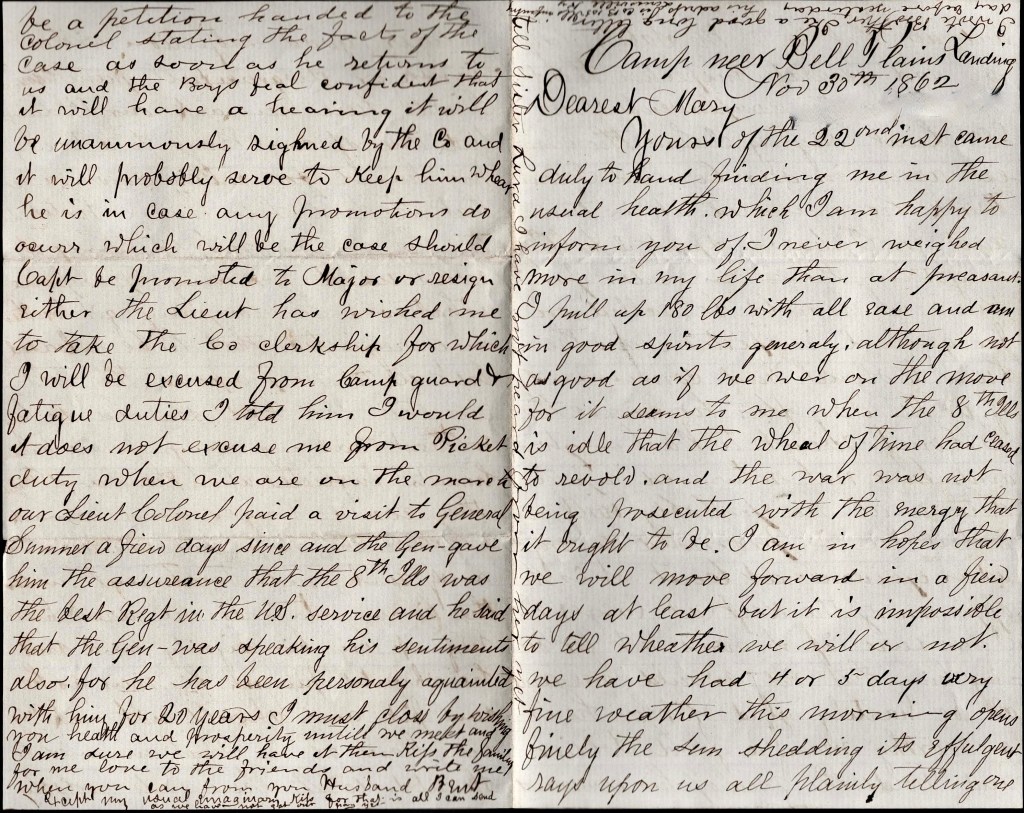 After we had eat all we wanted, Mat went & invited some of the Babcock’s Grove Boys to come & partake & so they finished the leavings—all but about half a pound of butter which she gave to our mess. Mrs Finely said, “Bent, don’t you wish Mary was here to help us eat this?” & she went on to relate how I never ought to have gone & left you. But I made her acknowledge that I was not so very cruel after all. I tell you, Mary, I thought of little Mitty more than 100 times that day for that little joker of theirs is just about as large as Mitty was when he left. I could not for the life of me keep my eyes off of the little witch. Charley is just as full of the old cat as he can live & they make just as much of him as ever. I am afraid they will spoil the little fellow before they think of it. Everybody makes everything of him.