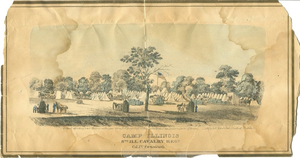 1 “After he start of the Civil War, Congressman and well known abolitionist John F. Farnsworth requested permission from friend, President Lincoln to commission a cavalry regiment and to train them in St. Charles Illinois, on property Farnsworth owned. The commission was approved on August 11, 1861. President Lincoln called the new regiment “Farnsworth’s Big Abolitionist Regiment”. Farnsworth was made Colonel. Colonel Farnsworth was close friends and political allies with Joseph Medill, Chicago Tribune Editor and co-owner. Medill was also an abolitionist and used the Tribune for the cause. Once approval was granted to form the 8th Illinois Cavalry, Medill promoted recruiting in the Tribune. By August 20, 1861 the first company of the 8th Illinois Cavalry was formed and most the members of that company were employees of the Chicago Tribune including William Medill, Joseph’s brother. Camp Kane officially opened for training on September 18, 1861 with 1,164 men who mustered in. It was the only Civil War Training Camp in Kane County. It first became home to the 8th Illinois Cavalry and later the 17th Illinois Cavalry.” Source: Camp Kane.