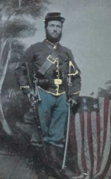 Bent was mustered in as a private in Co. E, 8th Illinois Cavalry on 18 September 1861 and he was mustered out on 28 September 1864. One source says he was “wounded four times with bullet and three times with sabre; September 15th, 1862, in six sabre charges within 40 minutes, captured seven confederate soldiers, armed, nearly a mile from any Union soldier; lost five horses shot under him in the three years’ service; in a Virginia raid captured a sutler and $5,000 worth of goods.”
