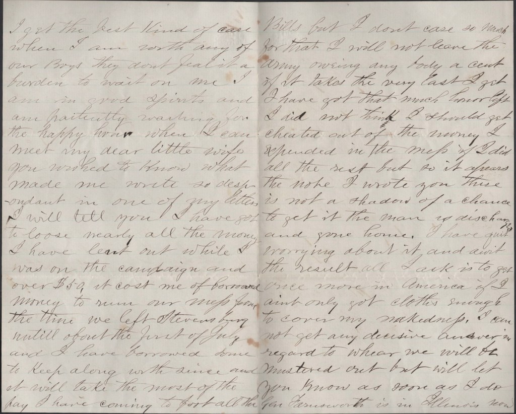 You wished to know what made me write so despondent in one of my letters. I will tell you. I have got to lose nearly all the money I have lent out while I was on the campaign and over $50 it cost me of borrowed money to run our mess from the time we left Stevensburg until about the first of July. And I have borrowed some to keep along with since. And it will take the most of the pay I have coming to foot all the bills. But I don’t care so much for that. I will not leave the army owing anybody a cent if it takes the very last I get. I have got that much honor left. I did not think I should get cheated out of the money I expended in the mess if I did all the rest, but so it appears. The note I wrote you, there is not a shadow of a chance to get it. The man is discharged and gone home. I have quit worrying about it and await the result. All I ask is to get once more in America, if I ain’t only got clothes enough to cover my nakedness.